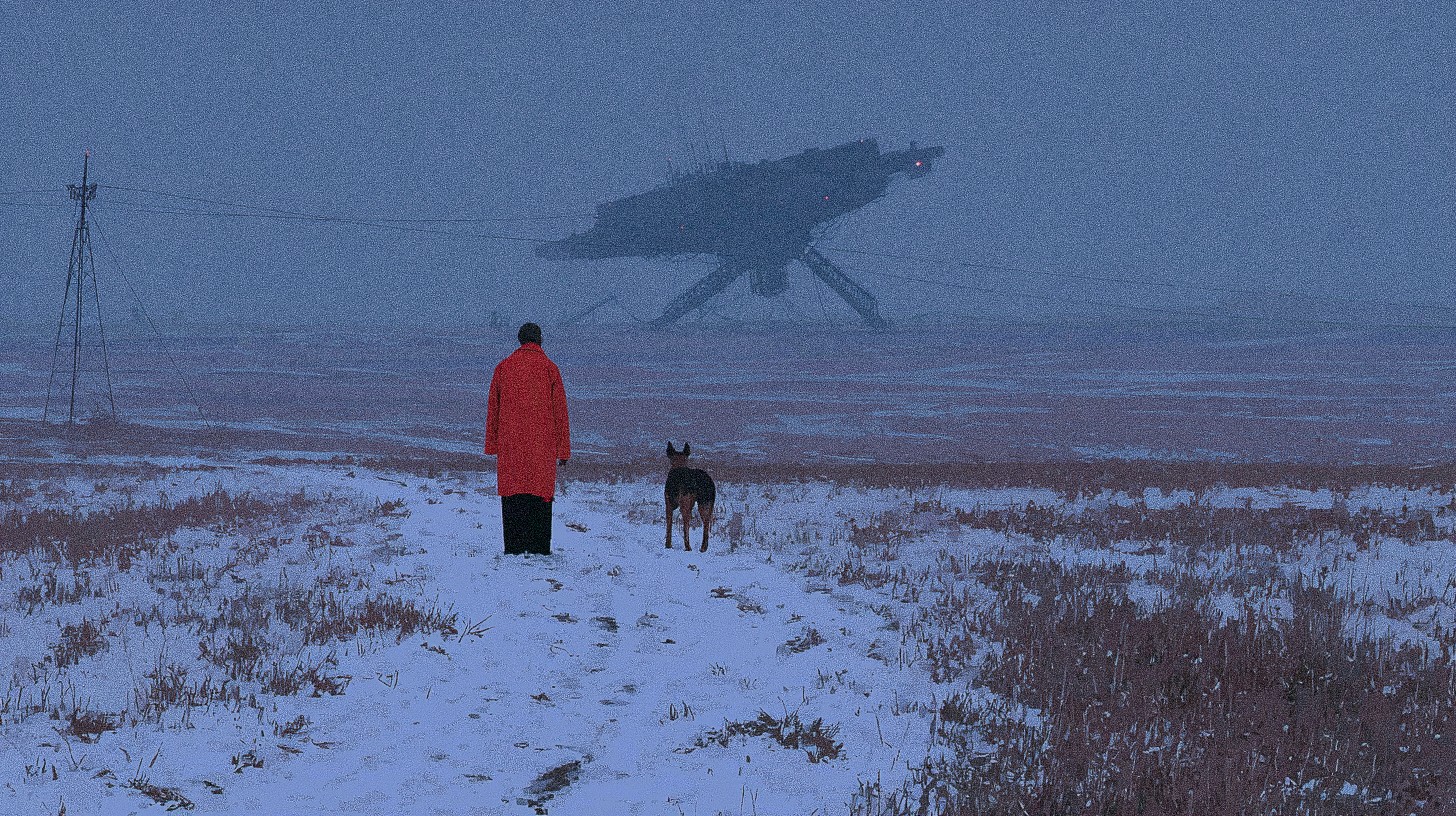 A digital painting capturing a desolate winter landscape at dusk. A lone man in a striking red coat stands with his dog in a field lightly dusted with snow. In the distance, a large, unidentified flying object, resembling a massive, dark mechanical bird or craft, hovers ominously. The sky is a hazy, muted blue, lending an air of mystery and slight dread. The brushstrokes should have a slightly grainy texture to enhance the bleak atmosphere. Incorporate elements of realism, but with an otherworldly twist. Aim for a color palette of blues, grays, whites, and the striking contrast of the red coat to draw the eye. The style should evoke a sense of isolation and quiet tension, reminiscent of a science fiction novel cover art. The overall composition should lead the viewer's eye from the man and dog to the looming craft in the distance.