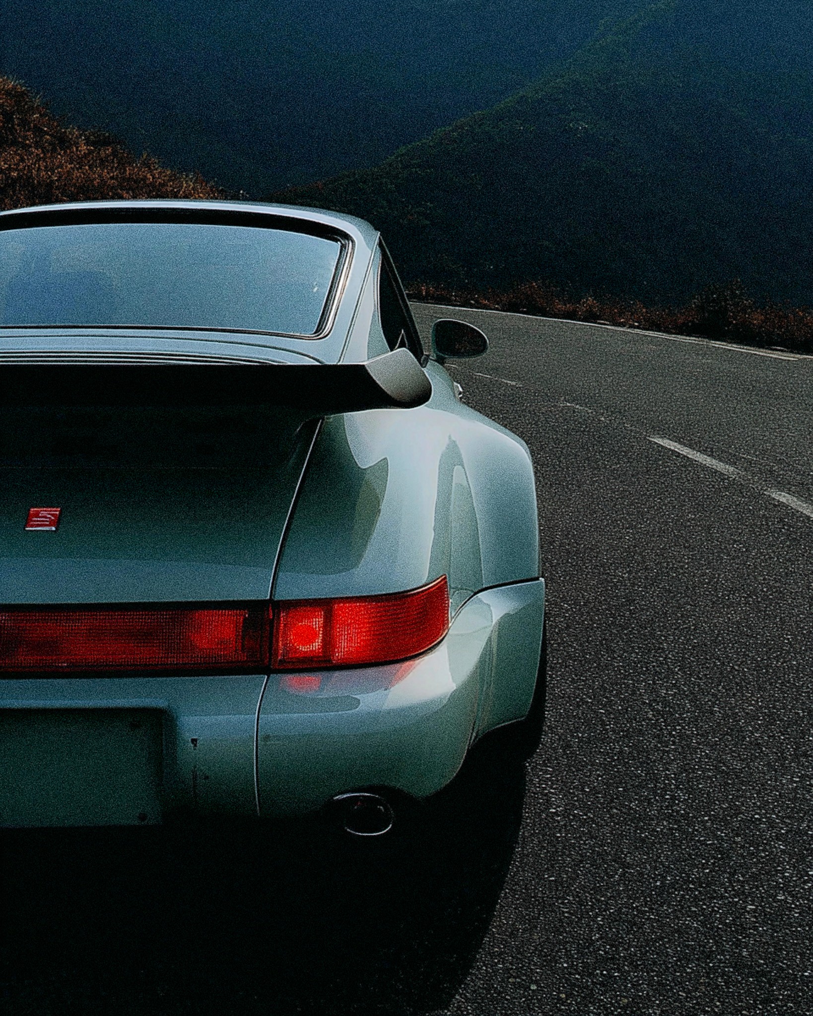 Close-up, rear view of a classic Porsche 911 parked on an asphalt mountain road at dusk. The car is a light blue or grey color with iconic rear lights illuminated. Dark moody shot with high contrast, cinematic lighting, dramatic shadows, film grain texture, capturing the essence of speed, nostalgia and classic automotive design. Background features mountain landscape shrouded in twilight. Soft, diffused light reflecting off the car's surface. Detailed road texture, shallow depth of field. Atmosphere of solitude and journey, captured with professional automotive photography techniques, Hasselblad camera, 50mm lens, f/2.8, ISO 200, 1/125 shutter speed, film grain, color graded for cinematic effect, Kodachrome tones.
