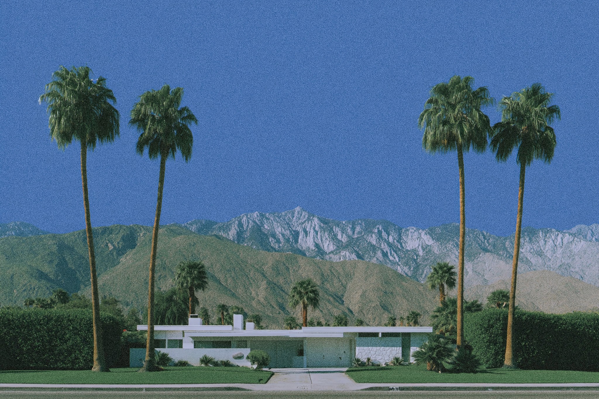 A photograph showcasing a quintessential Palm Springs mid-century modern house, with clean lines and minimalist design, foregrounded by towering palm trees with their iconic fronds swaying gently. The backdrop is dominated by the majestic San Jacinto Mountains, their peaks dusted with snow and casting long shadows across the desert landscape. The sky is a brilliant, cloudless blue, reminiscent of a vintage postcard. Capture the sharp contrasts of light and shadow, the warm tones of the desert meeting the cool hues of the mountains. Emphasize the geometric shapes of the architecture against the organic forms of the palms and mountains. Use a color palette inspired by mid-century modern design, incorporating shades of turquoise, orange, and yellow. The photograph should evoke a sense of tranquility, timelessness, and the unique blend of luxury and natural beauty that defines Palm Springs. Add subtle film grain for a retro touch, shot on Kodak Ektachrome, f/8, 1/125 shutter speed.