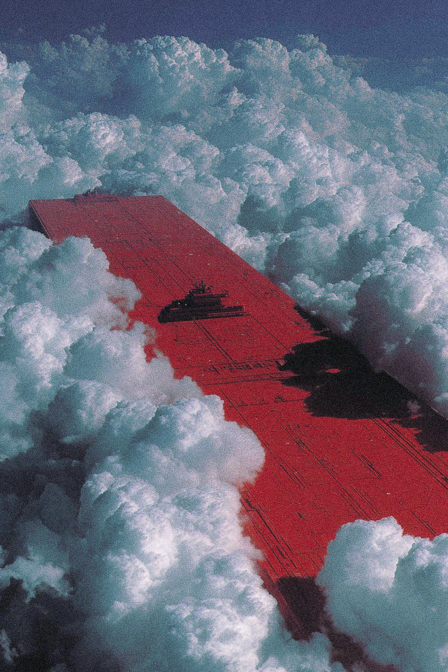aerial view, a massive red Star Destroyer emerging from thick, fluffy white clouds, dramatic lighting, cinematic composition, science fiction concept, intricate detailing on the Star Destroyer's hull, visible weapons emplacements, hints of a larger space battle in the background, high resolution, hyperrealistic, volumetric lighting, volumetric clouds, deep shadows, contrasting colors, sharp focus, photorealistic rendering, reminiscent of classic science fiction film stills, wide angle, high dynamic range, 8k resolution, cinematic color grading, post-processing enhancements, digital art, matte painting, detailed texture work, atmospheric perspective, epic scale, imposing presence, sense of wonder and awe