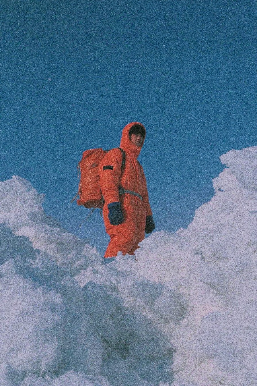 A solitary figure, clad in a striking orange mountaineering suit and carrying a bulky backpack, ascends a formidable, snow-laden peak. The sky overhead is a clear and radiant azure, providing a stark contrast to the pristine white of the snow and the bright orange of the suit. The climber's face, partially obscured by the hood, conveys a sense of determination and resilience. The snow is thick and uneven, presenting a difficult climb. The composition of the image emphasizes the climber's smallness in the vast landscape, highlighting the scale of the mountain and the climber's bravery in facing the challenge. Add film grain for a vintage aesthetic and use a medium telephoto lens to capture the details of the climber and the snowy terrain, depth of field, focus on the climber, wide-angle view, sharp focus.