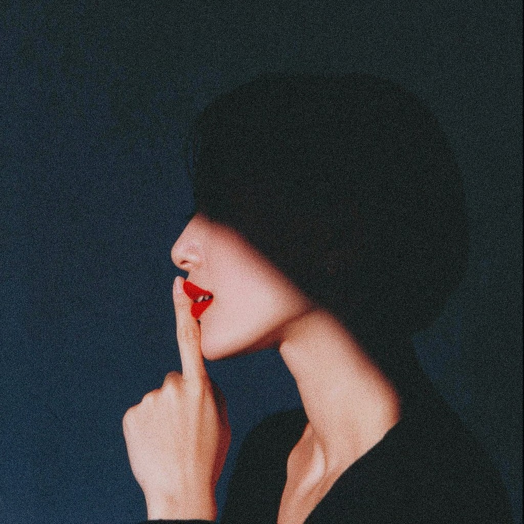 A striking portrait of a woman with bold red lipstick, finger to her lips, shrouded in shadow. The dark blue background enhances the air of mystery and intrigue in this beautiful capture.