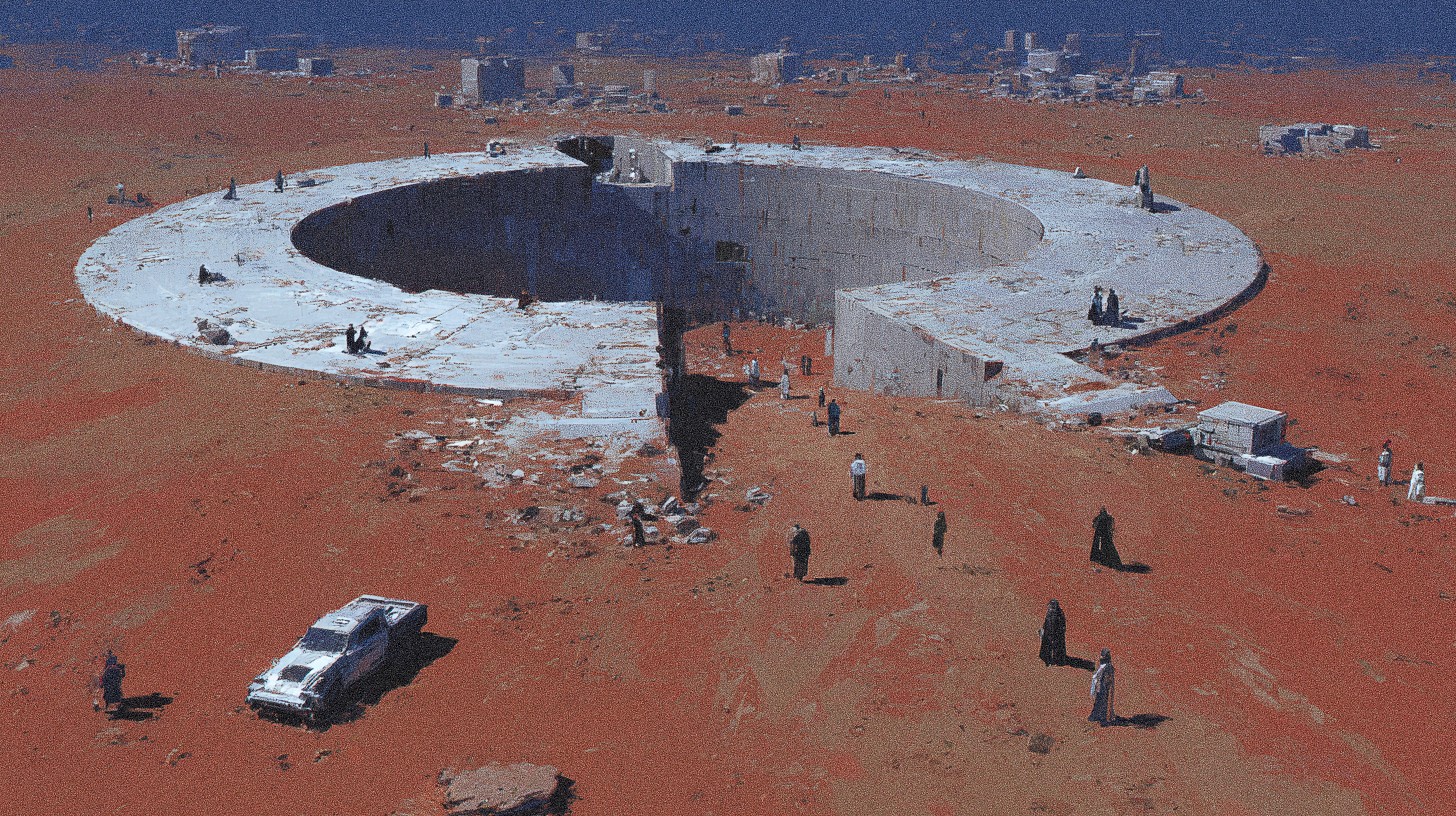 An aerial view of a massive, crumbling concrete circular structure, possibly a failed utopian experiment, dominating a rust-colored desert landscape, reminiscent of Mars. Small figures, some in modern clothing and others in more traditional garb, populate the area around the structure. Scattered amongst them are small utilitarian buildings and a futuristic vehicle parked nearby, adding to the sense of a lived-in, yet desolate environment. The sky is a dull, washed-out blue, heightening the feeling of isolation. The scene is rendered with a soft, painterly quality, capturing the stark beauty and quiet melancholy of a world in decline, cinematic lighting, high detail, 8k resolution.