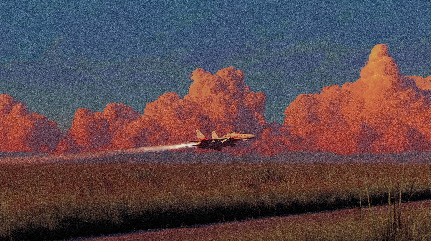A Mig-29 fighter jet flying low over a grassy field at sunset, fiery orange clouds fill the sky, vapor trails trailing behind, cinematic lighting, photorealistic, 8k resolution, high detail, octane render, detailed background, volumetric clouds, dramatic sky, hyperrealism, aviation art, vibrant colors, clear and crisp focus, depth of field, atmospheric perspective, digital painting, inspired by vintage aviation posters, realistic textures, dynamic composition, film grain.