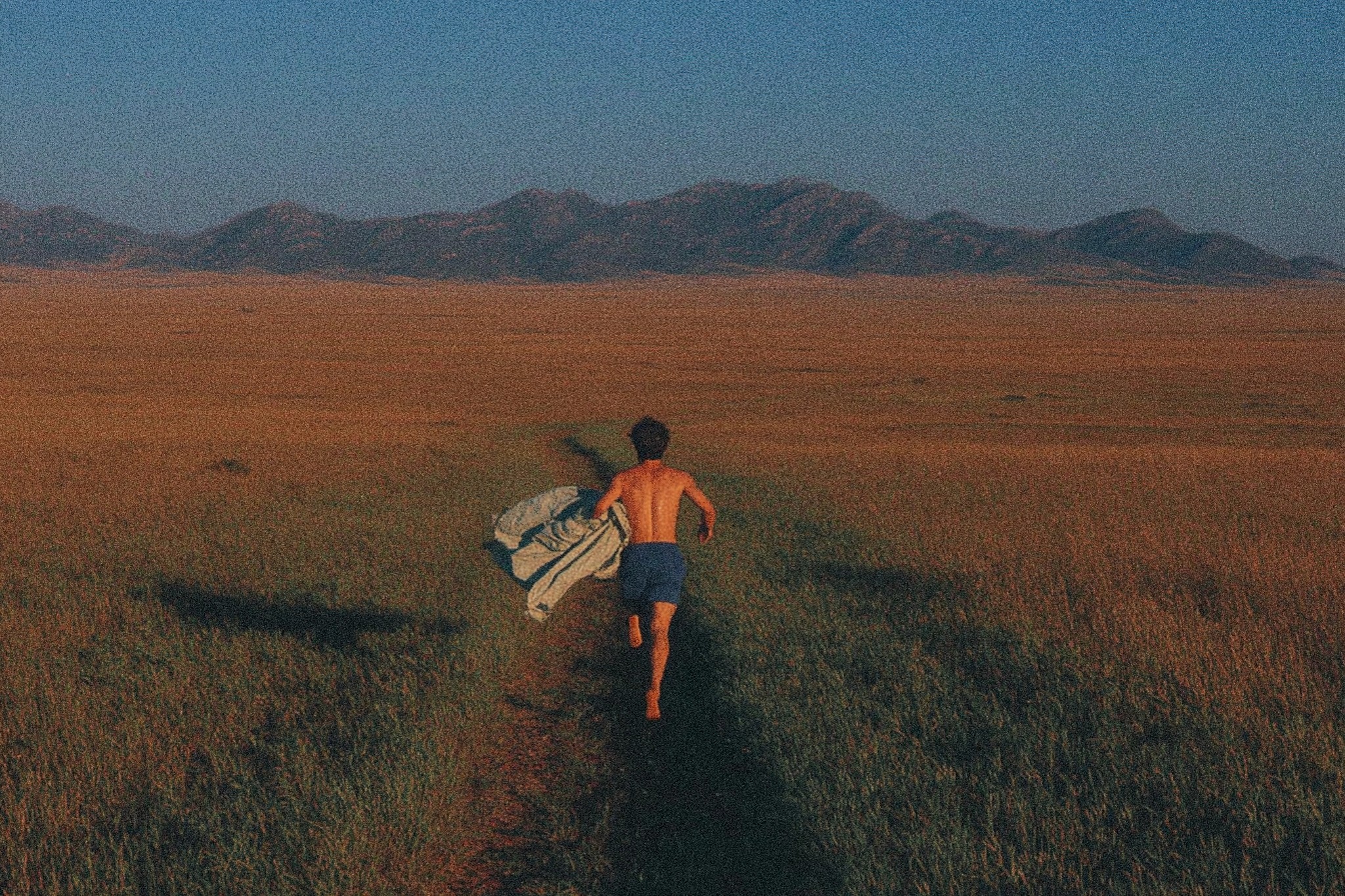 A solitary figure, a young man with a lean physique, running barefoot through a sun-drenched field of tall grass, the wind rustling through the stalks, carrying a draped blanket over his shoulder, back view, distant mountain range under a clear blue sky, cinematic, golden hour lighting, film grain, highly detailed, 8k, volumetric lighting, photorealistic rendering, shot on Hasselblad, shallow depth of field, focus on the runner's form, dynamic composition, sense of liberation, freedom, nature, solitude, escape, sunlit meadow, warm color palette, slight vignetting, inspired by Terrence Malick films, evoke a feeling of nostalgia and tranquility.
