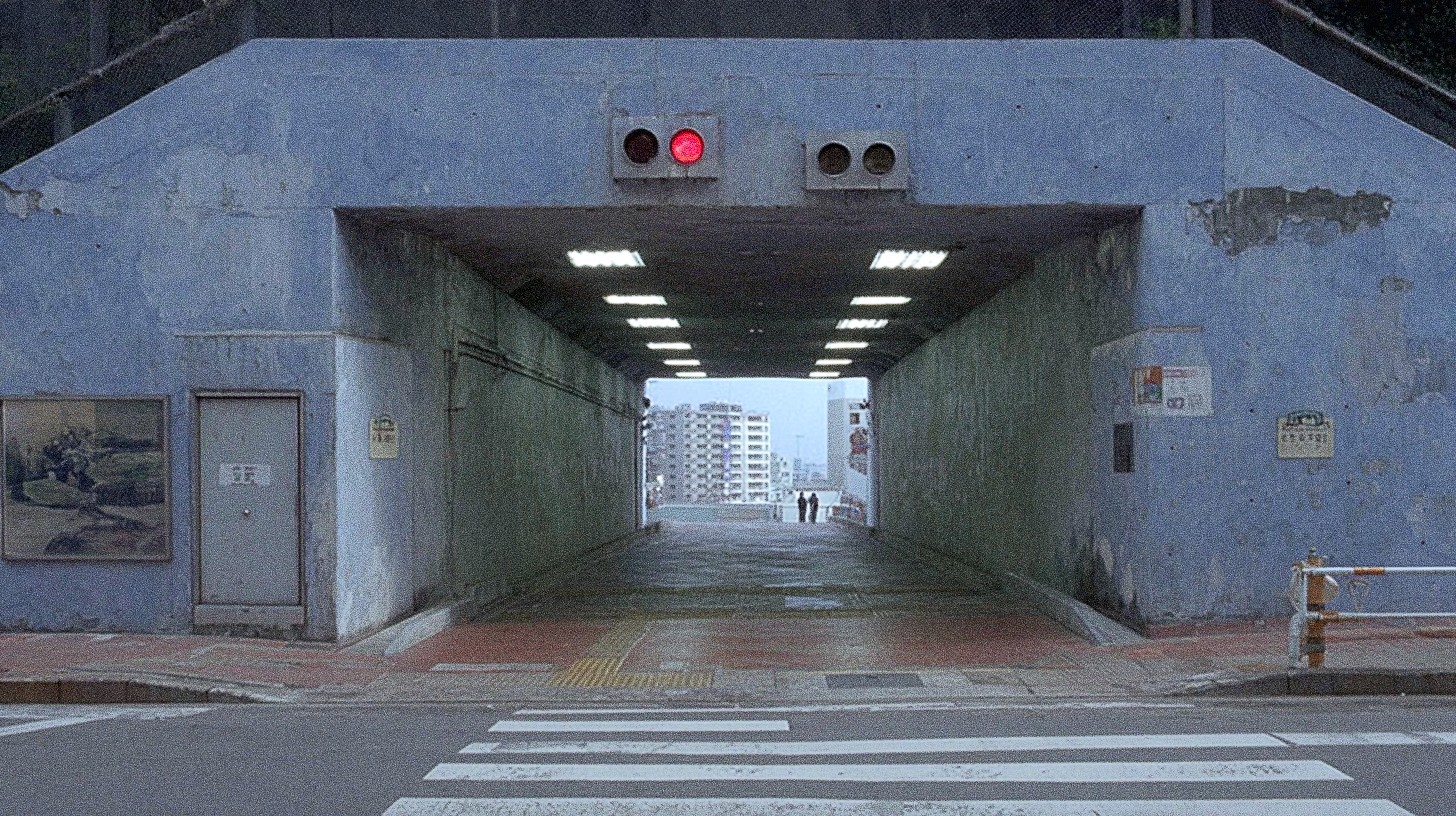 A long exposure shot of an urban tunnel in Japan, illuminated by artificial lights and framing distant figures against a cityscape backdrop. The worn textures and muted tones create a sense of isolation.