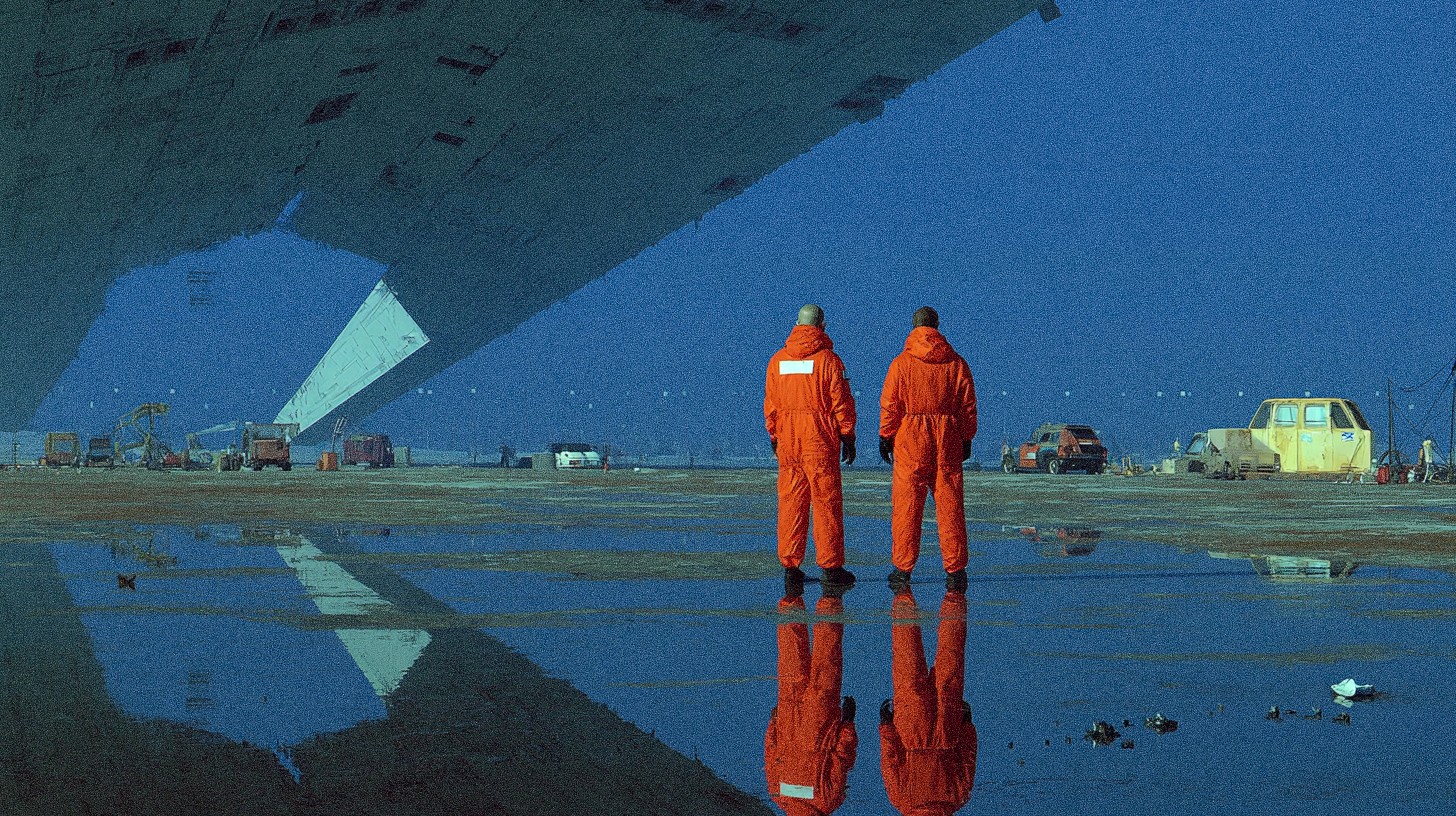 A cinematic still of two workers in bright orange suits standing on a flat, wet surface, gazing up at an impossibly large, alien structure in the distance. The sky is a stark, uniform blue, providing a sharp contrast to the ground and the figures. The colossal structure looms overhead, its precise shape obscured by its sheer size and the atmospheric perspective. Reflections of the workers and the structure ripple in the shallow water covering the ground. Various maintenance vehicles and equipment are scattered in the background, adding to the industrial, utilitarian feel of the scene. Capture the sense of awe and the mystery of encountering something beyond human comprehension. Use a color palette of deep blues and vibrant oranges to create a visually striking and thought-provoking composition, detailed textures, volumetric lighting, 8k resolution, photorealistic.