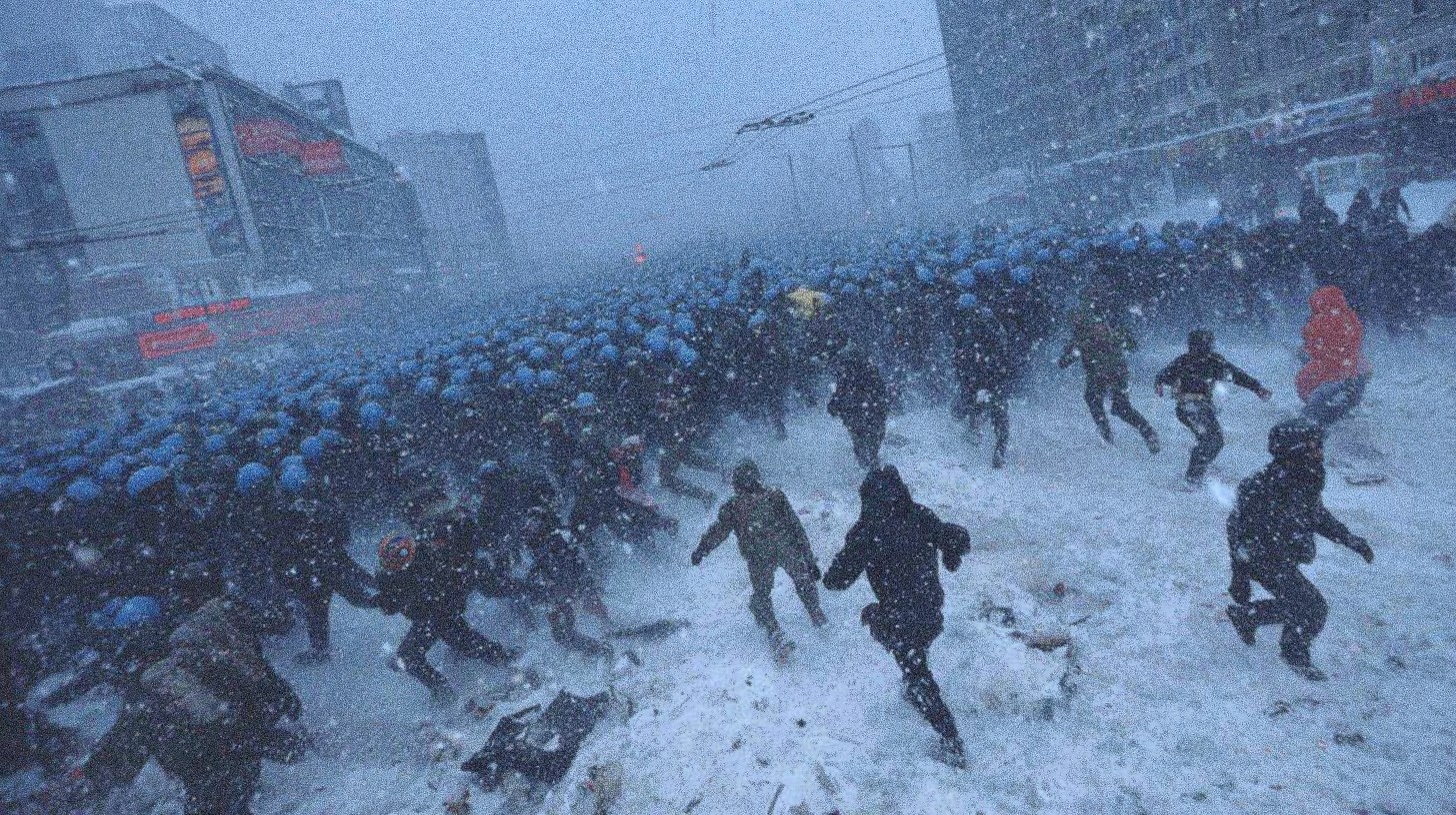A wide, chaotic scene unfolds in a snow-covered urban landscape, capturing the intensity of a riot. In the foreground, figures are seen running in various directions, their forms obscured by heavy snowfall, creating a sense of urgency and disarray. Many of them are dark and hooded, some are falling. In the background, a mass of individuals, predominantly law enforcement, clad in distinct blue helmets, stand as a formidable wall against the rioters. The snow swirls around them, adding to the dramatic atmosphere of the conflict. Tall buildings loom in the distance, their details softened by the blizzard, serving as a stark backdrop to the tumultuous scene. The composition captures the raw energy and tension of a confrontation in harsh weather conditions. The use of stark color contrasts, with the blue helmets against the white snow and dark clothing, enhances the visual impact. The image should evoke a sense of struggle, resilience, and the complex dynamics of urban unrest, photograph, street level view, blizzard, raw, emotional.