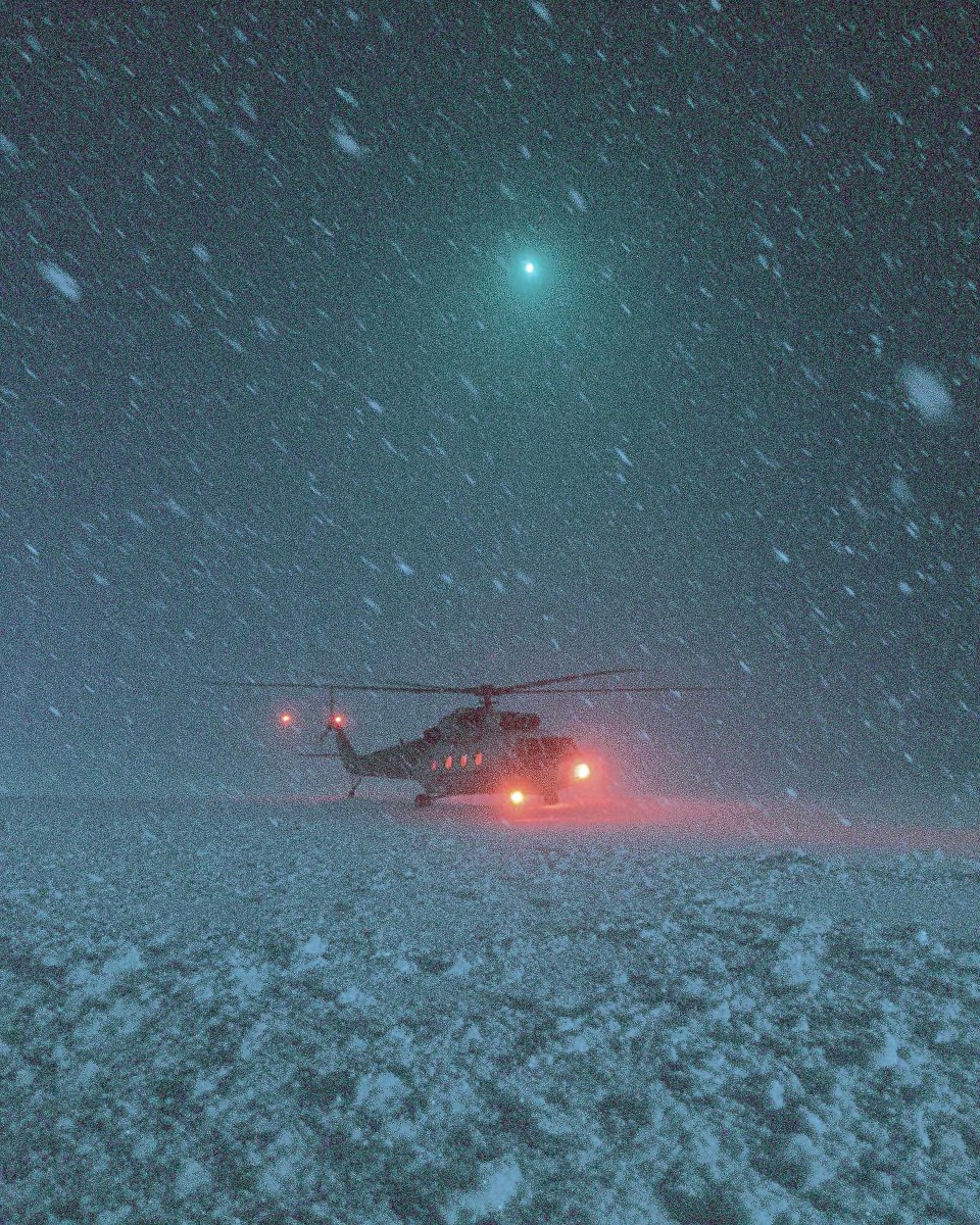 A breathtaking scene unfolds beneath a vast, stormy night sky dominated by a vibrant green comet. Below, a military helicopter, painted in muted greys and whites, struggles to land in a swirling blizzard. The ground is a chaotic expanse of snowdrifts, their texture rough and uneven. The helicopter's landing lights, a warm, radiant red and orange, cut through the dense snowfall, casting elongated shadows and illuminating the immediate surroundings. The comet hangs high in the sky, an otherworldly beacon casting a soft, ethereal glow upon the scene. The overall mood is one of tension and drama, with the elements conspiring against the machine. Use a high-resolution, photorealistic style, with a focus on capturing the dynamic interplay of light and shadow, the texture of the snow, and the vastness of the night sky. --ar 16:9 --v 5 --zoom 1.2