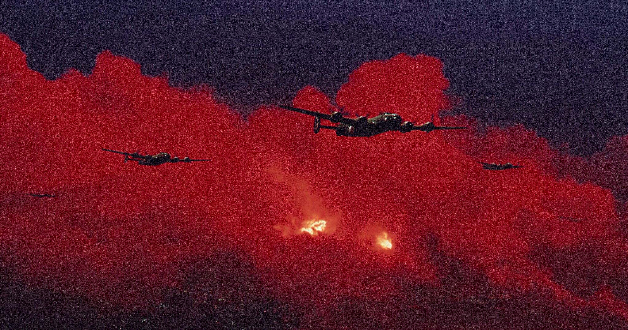Create a dramatic and surreal image of a squadron of vintage World War II bombers flying through a blood-red sky filled with swirling clouds and fiery effects. The aircraft should be silhouetted against the intense red glow, with visible details like propellers, wings, and fuselage. Below, the faint lights of a city should be discernible through the haze. The overall tone is ominous and otherworldly, evoking a sense of impending doom or a dreamlike alternate reality. Use volumetric lighting to create depth and atmosphere. The style should resemble a classic war film poster with vibrant colors and dramatic composition, with a touch of fantasy or surrealism. Capture the essence of flight and danger.