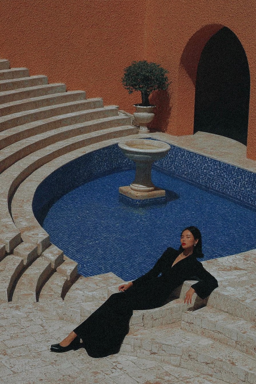 A captivating full shot captures a slender woman in a sleek black suit lounging elegantly on aged stone steps, her eyes closed, basking in the warm sunlight. She is positioned adjacent to a tranquil, blue-tiled pool featuring a classic fountain centerpiece. The backdrop showcases a Mediterranean-inspired courtyard, complete with terracotta walls, arched doorways, and meticulously landscaped greenery. The overall composition is characterized by a serene, minimalist aesthetic, using a shallow depth of field to emphasize the subject and subtly blur the background. The lighting is soft and diffused, enhancing the peaceful, sun-kissed atmosphere. Shot on Hasselblad, f/2.8, ISO 100, 35mm lens, cinematic lighting, style of Slim Aarons, vogue editorial --ar 2:3