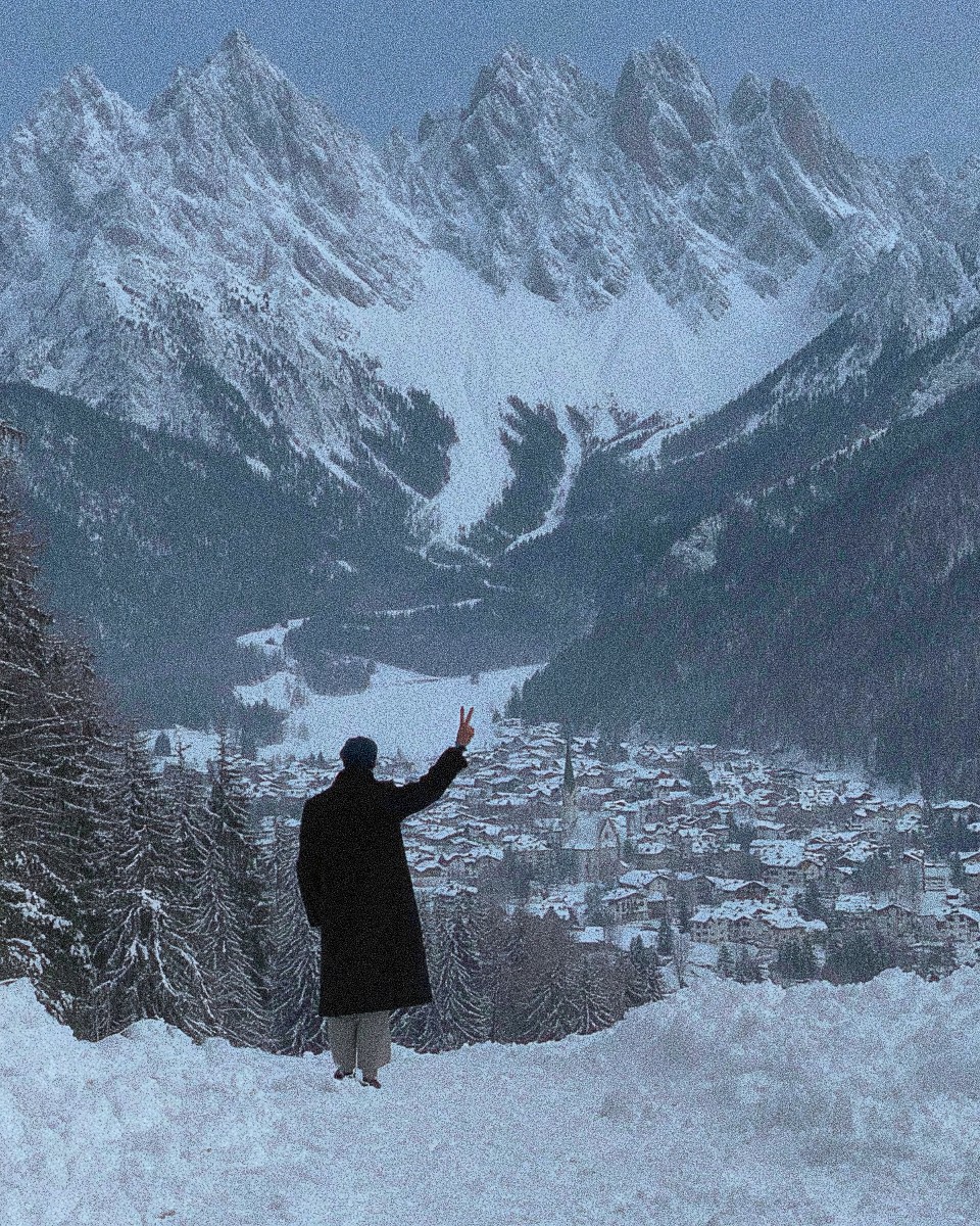 A solitary figure, back to the viewer, stands atop a snow-covered hill, raising a hand in a peace sign. They are dressed in a long, dark coat and a beanie. Before them lies a picturesque village nestled in a valley, its rooftops blanketed in snow. Towering over the village are majestic, jagged mountains, their peaks covered in pristine white snow. Dense evergreen forests flank the slopes of the mountains, creating a sense of depth and scale. The sky is overcast, casting a soft, diffused light over the scene. The overall mood is serene and peaceful, evoking a sense of awe and wonder at the beauty of nature. Photorealistic, hyperdetailed, 8k resolution, cinematic lighting, winter wonderland.