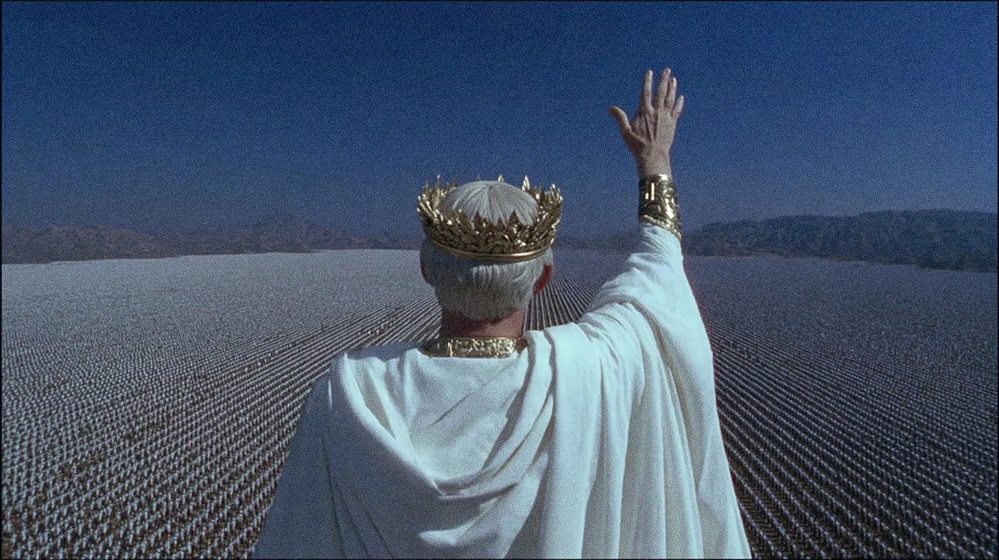 A wide shot of a figure, seen from the back, wearing a golden crown and ornate gold jewelry, standing at the edge of a seemingly endless field of orderly rows, possibly a desert or a vast agricultural landscape. The sky is a clear, unbroken blue. The figure is draped in white robes and raises a hand in a gesture that could be a wave or a command. The light is bright and unforgiving, accentuating the starkness of the scene. The atmosphere is one of power and isolation. Inspired by biblical epics and dystopian narratives. Ultra-realistic detail, 8k resolution, cinematic lighting, shot on Arri Alexa.