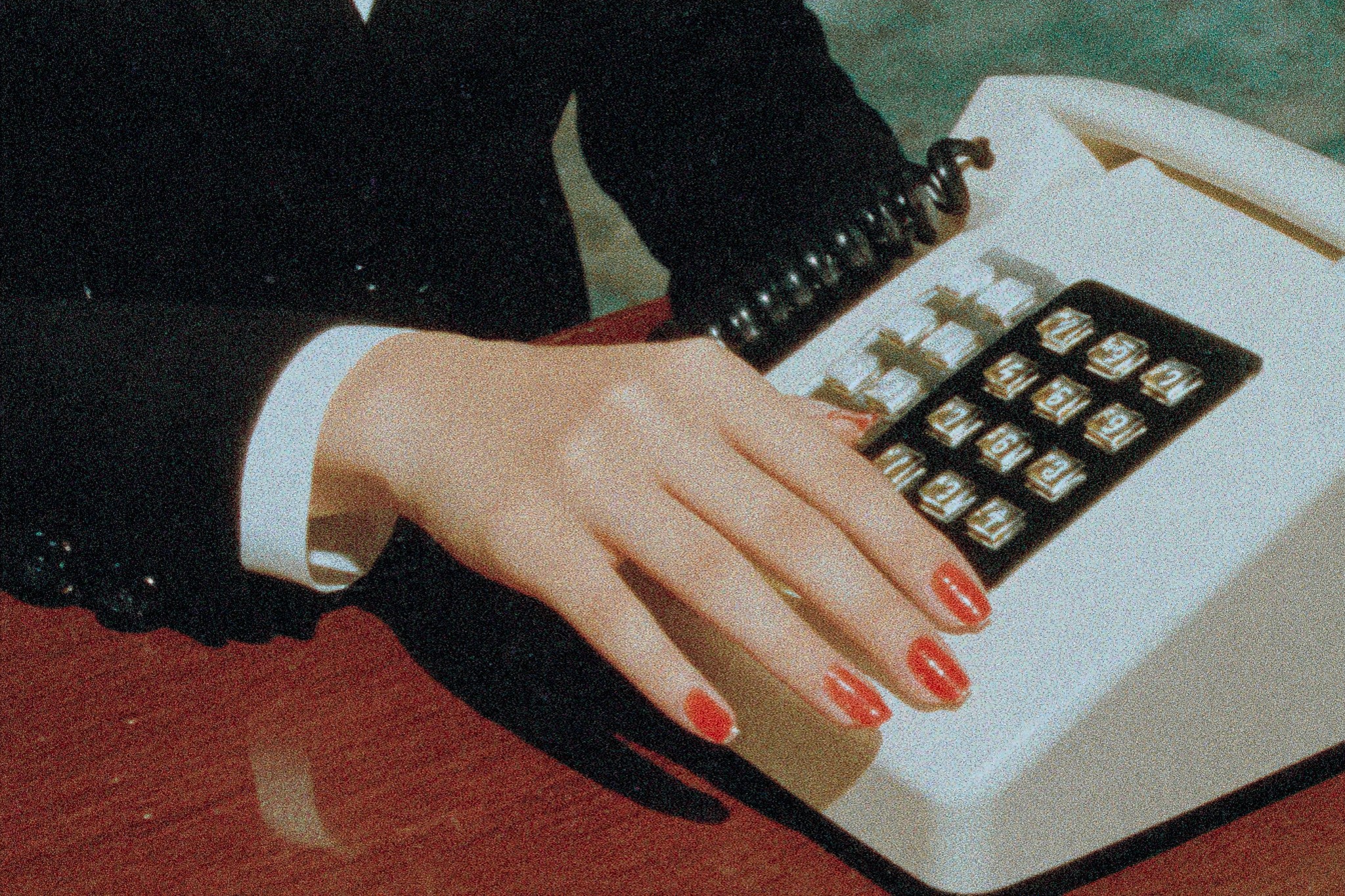 Close-up shot of a woman's hand with vibrant red nails gently resting on a classic, vintage rotary telephone. The phone is a pristine white, contrasting with the reddish-brown wood grain surface beneath. The scene is illuminated with soft, diffused lighting, giving it a slightly grainy, retro feel reminiscent of old film photography. The woman is wearing a black suit. The overall aesthetic should evoke a sense of nostalgia and timeless elegance, emphasizing the tactile connection between the human hand and the iconic technology of the past. The background is intentionally blurred to keep the focus on the hand and the phone. Capture the details of the phone's texture and the subtle imperfections that give it character. --ar 3:2 --style 400