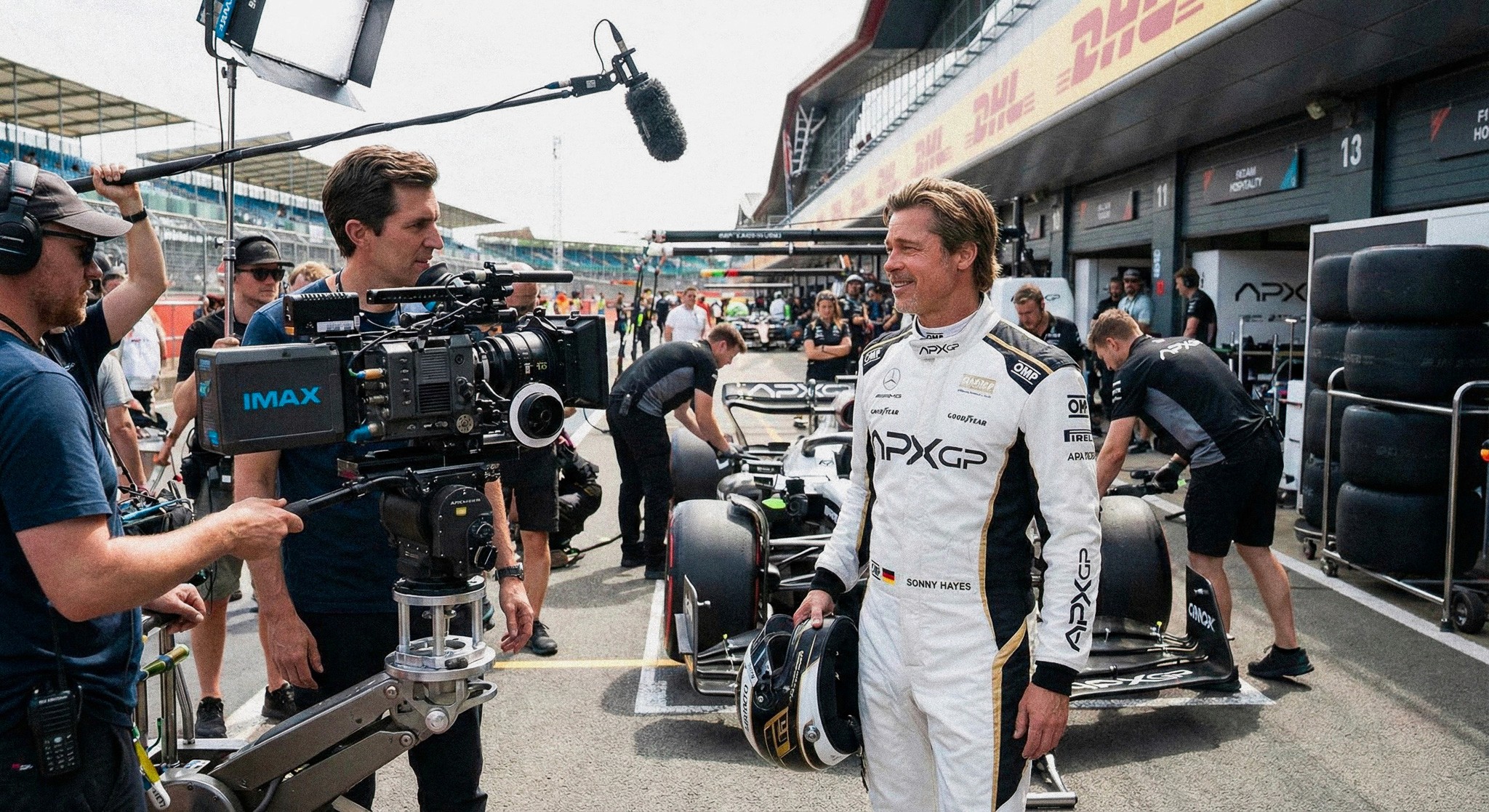 A candid shot of Brad Pitt on the set of his new Formula 1 movie at Silverstone. He is dressed in a white and black APXGP racing suit, holding a helmet and smiling. In the background, there's a Formula 1 car and crew members working around it. A large IMAX camera setup and crew members are visible in the foreground, capturing the scene. The overall atmosphere is bustling and energetic, reflecting the high-octane nature of Formula 1 racing. The color palette is bright and sunny, enhancing the vibrant atmosphere of the race track. The lighting highlights Brad Pitt's features, accentuating his smile and charisma. The composition captures the behind-the-scenes feel of movie-making, combined with the thrill of Formula 1 racing. The image should evoke a sense of excitement and anticipation for the upcoming movie.