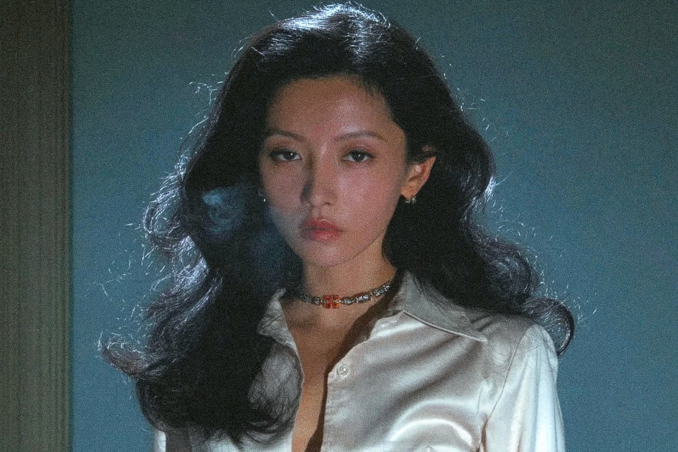 A cinematic portrait of a young woman, styled with voluminous black hair and a red ornate choker, wearing a slightly unbuttoned satin button-up shirt, vintage 70s filter, shot on film, soft lighting, muted color palette, subtle facial details, shallow depth of field, moody blue background, elegant pose, fine grain texture, high resolution, 8k, dramatic shadows, artistic composition, detailed hair strands, realistic skin texture, analog aesthetic, nostalgic vibe, sophisticated styling, classic portraiture, cinematic lighting, beautiful face, expressive eyes, professional retouching, flawless skin, captivating gaze, dreamy atmosphere, intricate details, studio shot, depth of field, perfect composition, volumetric lighting, hyperrealistic, award-winning photography.
