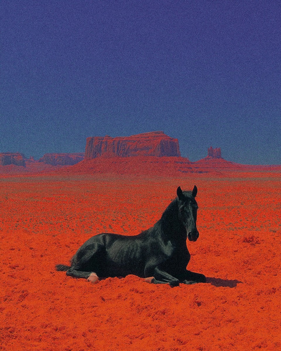 A stunning photograph of a sleek black horse lying down in a vibrant red desert landscape, deep blue sky above, southwestern mesas in the distance, highly detailed, hyperrealistic, octane render, 8k resolution, dramatic lighting, volumetric effects, color grading, art by Gregory Crewdson and David LaChapelle, surreal, dreamy atmosphere, film grain, cinematic composition, medium shot, focus on the horse's elegance and the unusual color contrast, sand texture, equine beauty, wild west aesthetic, unique, striking, artistic interpretation, style of 'Fear and Loathing in Las Vegas' movie scenes, anamorphic lens flare.