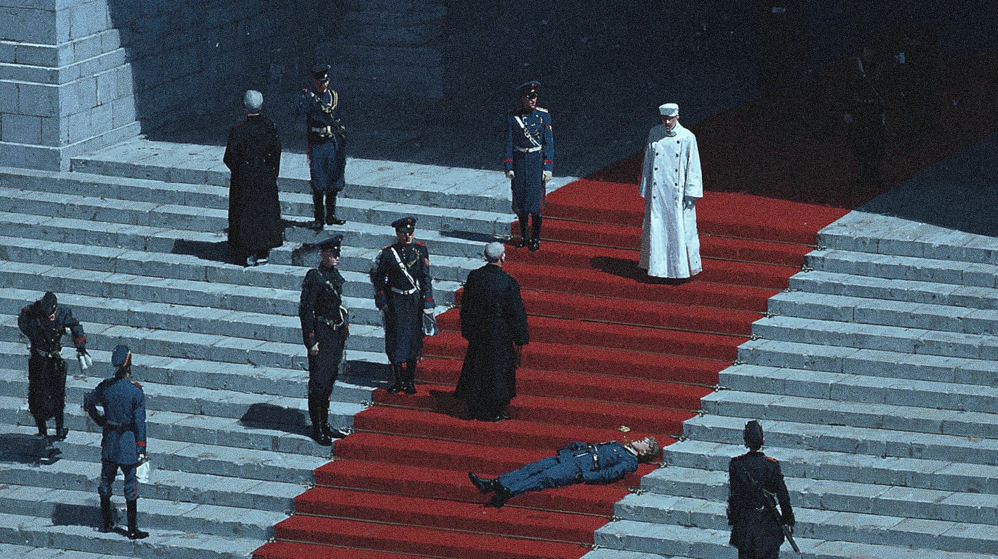 A high-angle shot of a grand, wide staircase covered in a deep red carpet, leading to a monolithic stone structure. Several figures in military uniforms stand in rigid formations, their faces obscured by shadow or distance. A single figure lies prone on the carpet, seemingly fallen or injured, creating a focal point of tension. The lighting is stark, with strong contrasts emphasizing the architectural details and the somber mood. A lone figure in a white coat stands at the top of the staircase, observing the scene with an air of detachment. The composition is symmetrical, with the lines of the staircase converging towards the center, drawing the viewer's eye to the fallen figure. The overall atmosphere is one of political intrigue, betrayal, and the fragility of power, reminiscent of historical moments of assassinations and coups. Use soft, diffused lighting to create a sense of unease and suspense, emphasizing the human drama playing out against the backdrop of imposing architecture. Add subtle grain and texture to enhance the vintage, cinematic feel.