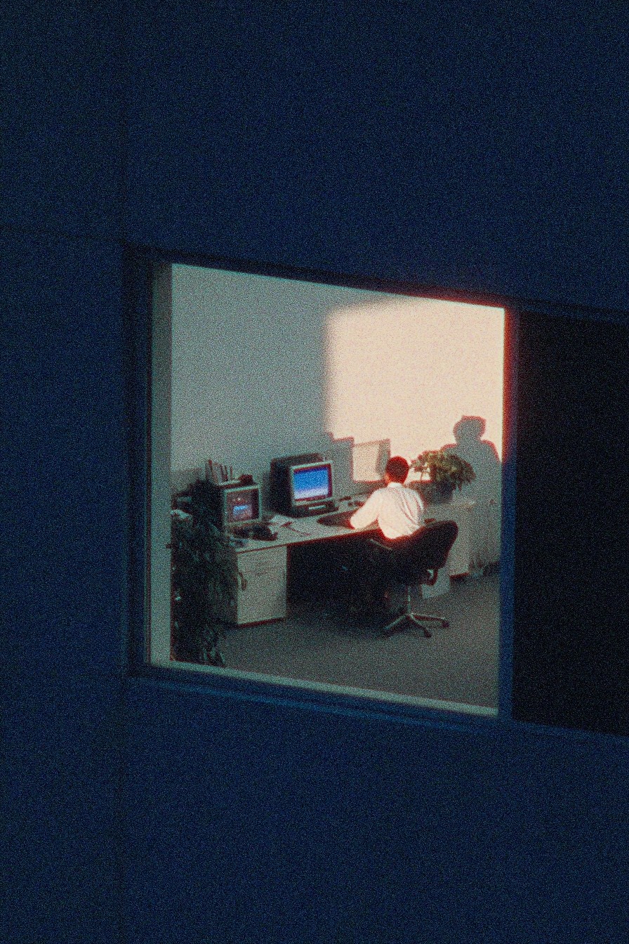 A medium shot through a window of an office worker at their desk late at night, bathed in the glow of computer screens, creating a soft, diffused light, high contrast, cinematic, film grain, focus on the subject, backlighting, moody atmosphere, dark color palette, shot on a vintage film camera, Kodak Portra 400, f/2.8, 50mm lens, intricate details, high resolution, 8k, dramatic lighting, volumetric lighting, shadow play, realistic rendering, photorealistic details, captured in a dimly lit office environment, evoking a sense of loneliness and determination.
