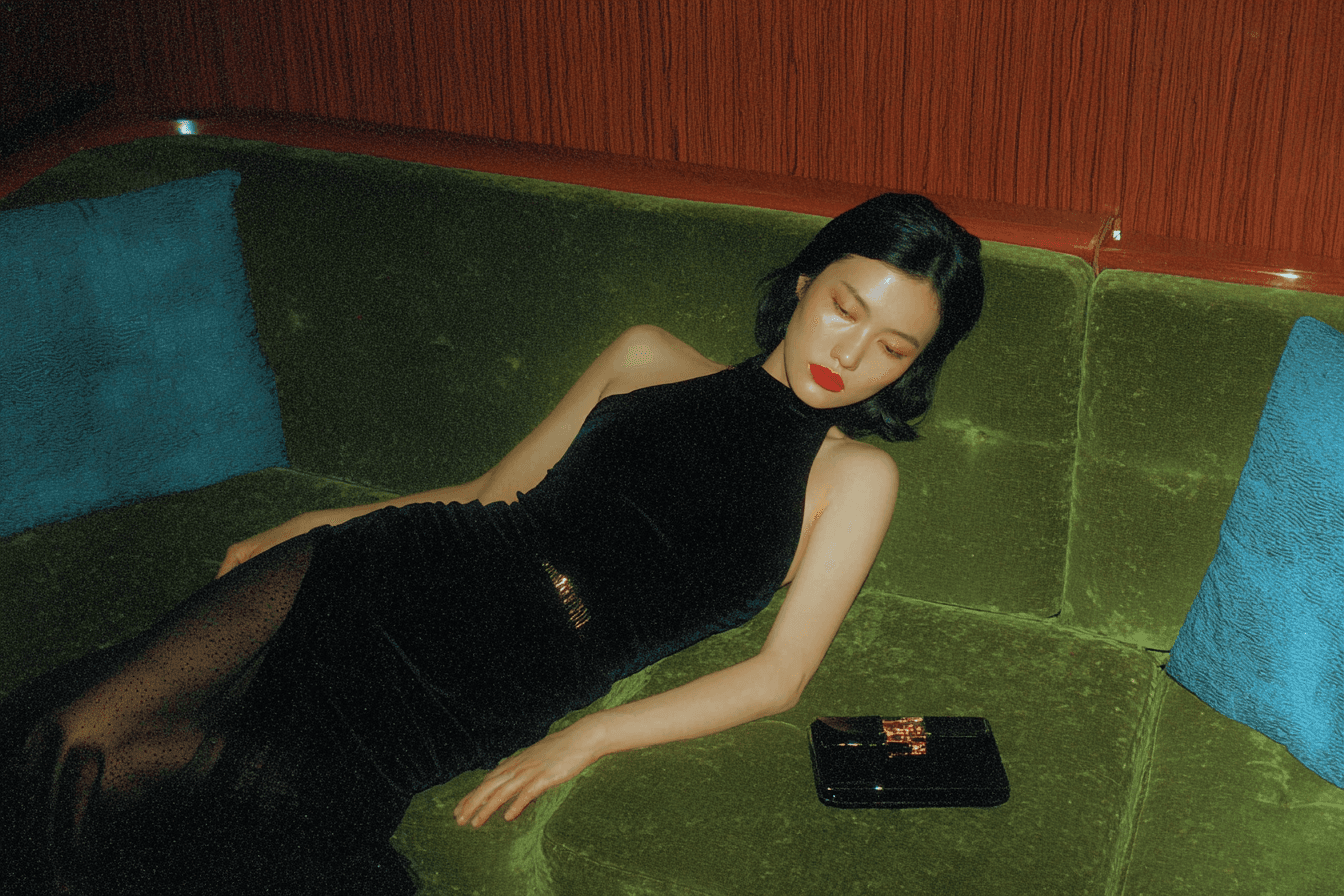 A stunning woman with porcelain skin and bold red lipstick reclines elegantly on a vintage green velvet sofa. She wears a sleek black velvet halter dress, the fabric catching the light with subtle shimmer, revealing a hint of sheer fabric at the bottom. The setting is warmly lit, with a rich, reddish-brown textured wall in the background. A blue textured throw pillow adds a pop of color against the green. Beside her, a glossy black clutch with a golden clasp rests on the sofa. The atmosphere evokes a sense of vintage glamour and quiet luxury, reminiscent of a 1970s film still. Focus on the textures - the plush velvet, the smooth skin, the reflective clutch - to capture the essence of the scene. Use soft, diffused lighting to create a warm and inviting mood. The color palette should emphasize deep greens, blacks, reds, and a touch of gold for accents. --ar 3:2 --style expressive