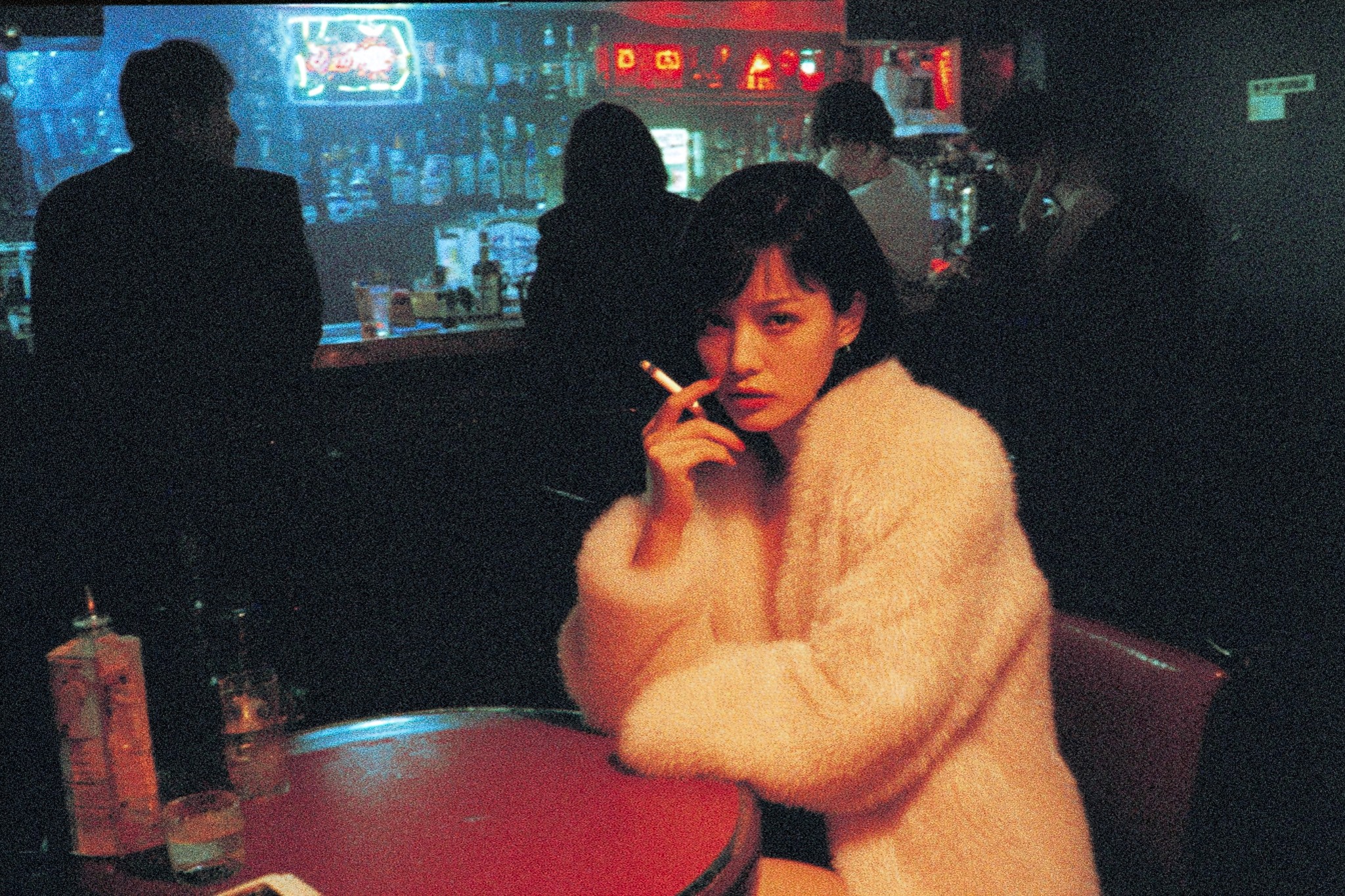 A captivating portrait of a young woman in a luxurious fur coat, seated at a red-topped table in a dimly lit bar, her delicate hand holding a lit cigarette, smoke gently curling around her face, moody atmosphere, bar scene filled with silhouettes of people in the background, shelves of bottles, reflected neon signs, soft focus, film grain, shot on cinestill 800t, shallow depth of field, raw and candid, cinematic lighting, captured with a Canon EOS 5D Mark IV, EF 50mm f/1.2L USM lens, ISO 3200, 1/60 sec, f/1.4