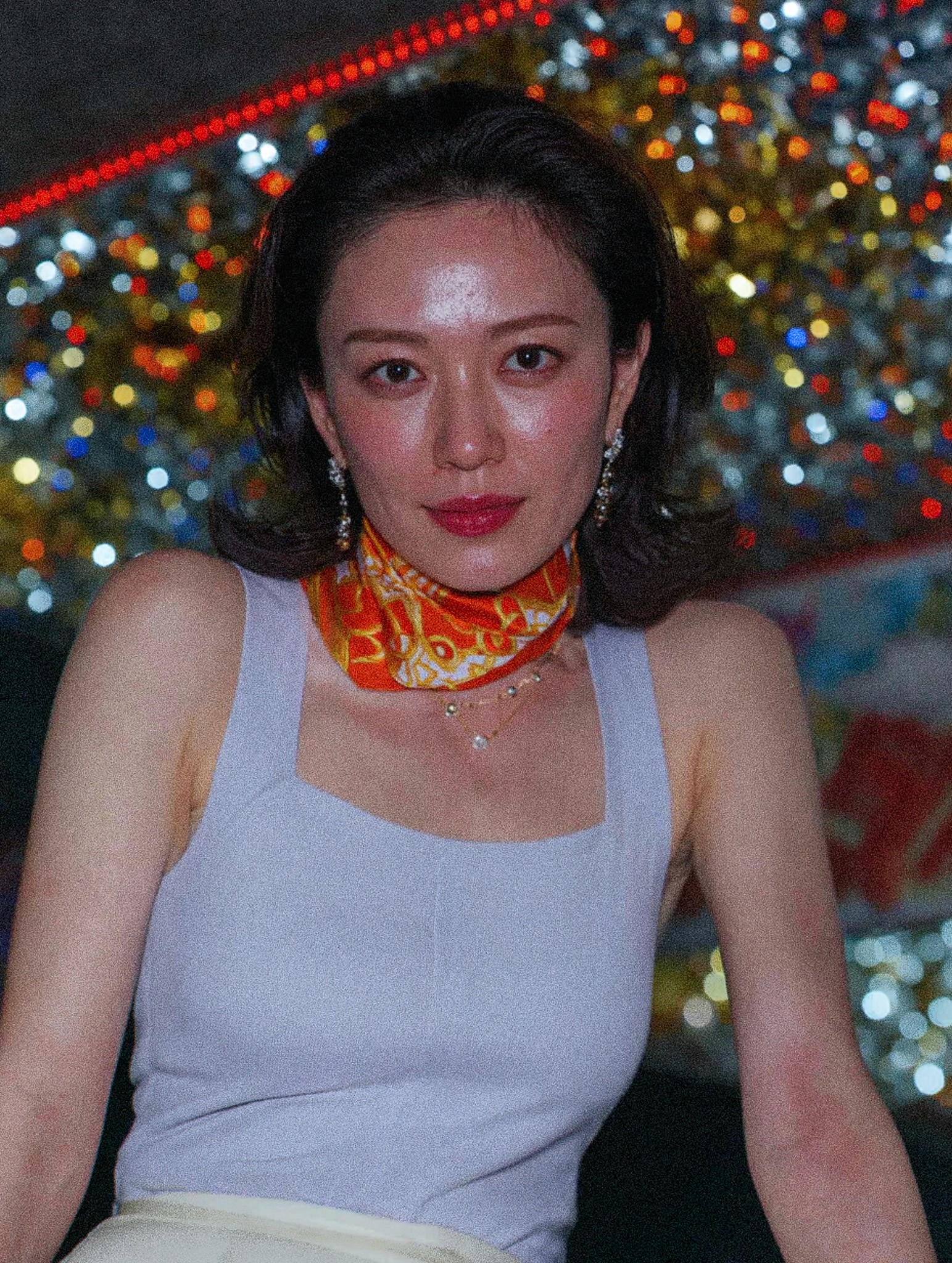 Close-up portrait of a beautiful woman, soft focus, elegant pose, flawless skin, wearing a lavender tank top and an orange patterned scarf, delicate gold necklace, sparkling diamond earrings, standing in front of a backdrop of blurred festive lights, bokeh effect, shallow depth of field, cinematic lighting, vibrant colors, shot on a Sony A7III with a 85mm lens, f/1.8 aperture, ISO 200, professional color grading, high resolution, realistic details, ultra photorealistic, trending on artstation, 8k, dramatic atmosphere, mysterious, captivating gaze, serene expression, soft highlights, sharp focus on eyes, subtle makeup, natural skin texture, glowing aura, dynamic composition, intricate details, volumetric lighting, award-winning photography, timeless elegance, ethereal beauty, reminiscent of a Rembrandt painting, in the style of Annie Leibovitz.