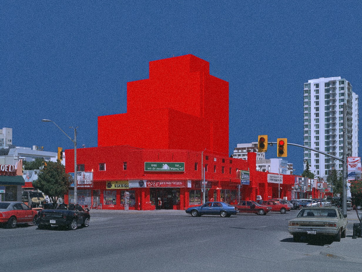 A vibrant photograph capturing a striking, boxy, bright red building in a bustling urban setting, daytime, clear blue sky, captured with a sharp focus and a shallow depth of field, highlighting the texture of the building's facade. The building is surrounded by city streets filled with cars, pedestrians, and other buildings, creating a dynamic and lively scene. The composition should emphasize the contrast between the bold red color of the building and the surrounding urban environment, creating a sense of visual tension and excitement. The overall mood of the photograph is one of energy and vibrancy, capturing the essence of city life. Include street lights, shop signs and vintage cars. Style of Stephen Shore.
