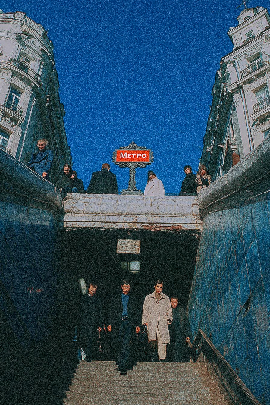 A vintage photograph of a metro station entrance in a European city, warm retro tones, bright blue sky overhead, people dressed in classic coats and attire descending the stairs, a red 'METRO' sign prominently displayed above the entrance, vintage architecture flanking the entrance, shot with a film camera, grainy texture, nostalgic feel, capturing the essence of urban life in Europe during the 1970s, vintage filter, shot on Kodak Portra 400, depth of field, cinematic lighting, volumetric lighting, medium shot, 35mm lens, hyperrealism, trending on artstation, unreal engine, Octane render, 8k resolution.