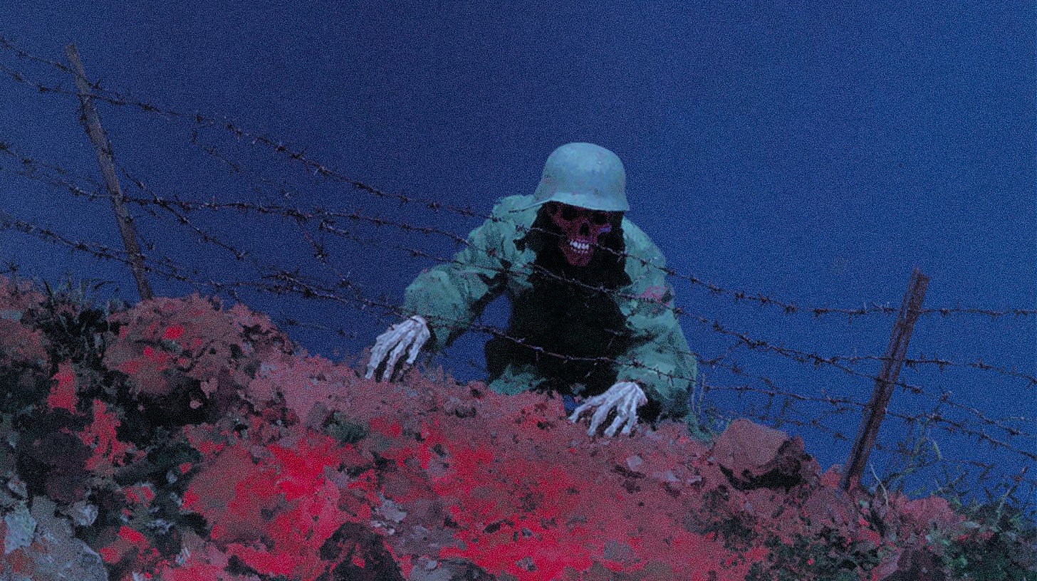 A terrifying scene of an undead soldier crawling through barbed wire on a battlefield, a photorealistic depiction with deep focus, dramatic lighting with a dark blue night sky as a backdrop, the soldier is skeletal but dressed in a tattered green military uniform and helmet, the barbed wire is rusted and menacing, the mound is covered in dark red and brown earth, rendering with high detail and cinematic quality, a sense of dread and despair, highly detailed, sharp focus, 8k, octane render, cinematic lighting, volumetric effects, dramatic composition, use of color to emphasize the horror, inspired by World War I trench warfare and zombie horror films, add elements of decay and ruin, realistic textures and materials, unsettling and impactful imagery, award-winning photography style