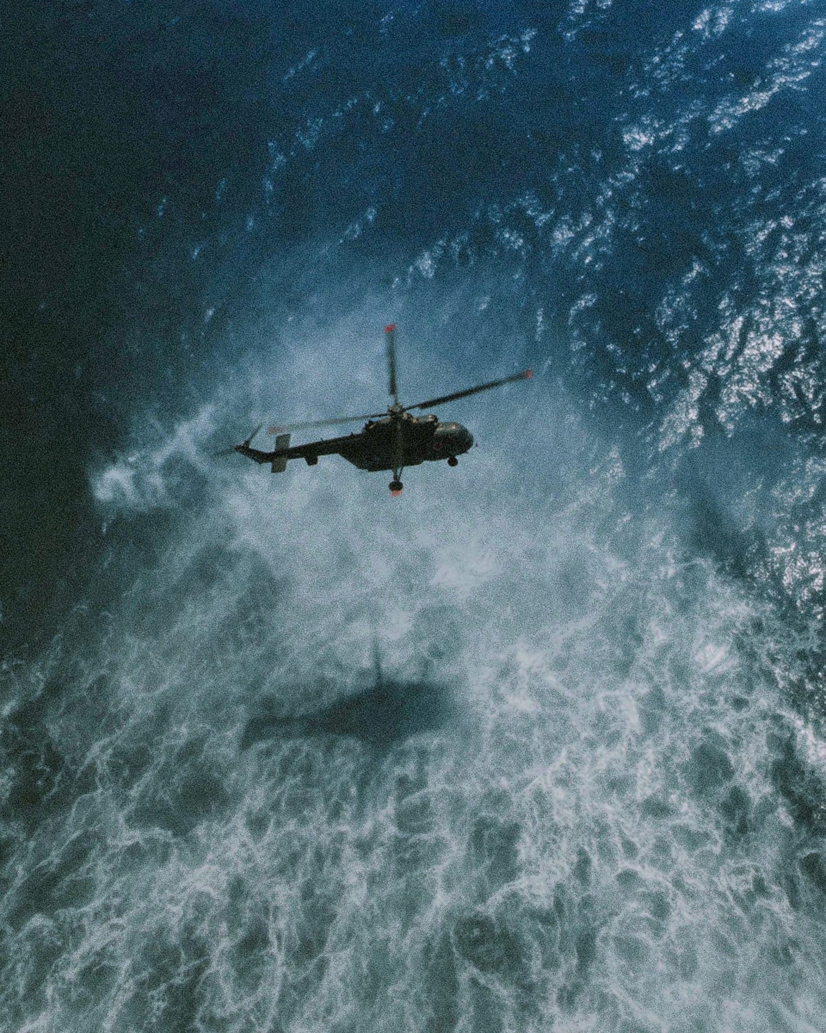 Aerial view of a helicopter silhouetted against the turbulent surface of a storm-tossed sea, shot from directly overhead, capturing the contrast between the machine and the raw power of the ocean, dramatic lighting, deep blues and whites of the water, sharp focus on the helicopter with slight motion blur on the blades, dark shadow of the helicopter cast on the water's surface, high contrast ratio, gritty texture, cinematic composition, realistic rendering, volumetric lighting, f/8, 50mm lens, ISO 200, 1/500s shutter speed, photographed by a professional aerial photographer, ultra quality, high resolution.