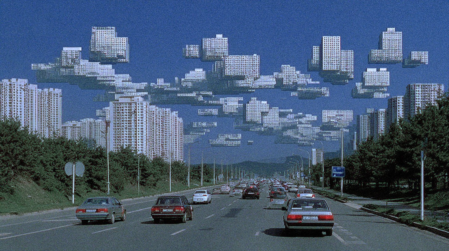 A surreal and captivating photograph capturing a highway bustling with cars under a sky populated by floating architectural structures, reminiscent of buildings and cityscapes. The scene blends urban density with dreamlike fantasy. Focus on the stark contrast between the grounded reality of the highway and the whimsical, gravity-defying structures above. The color palette should be slightly desaturated, emphasizing a sense of nostalgia and wonder. Incorporate elements of post-Soviet architecture within the floating structures. Add subtle textures and details to the buildings, hinting at a history and depth beyond their fantastical presence. The angle should be from slightly elevated perspective, allowing the viewer to take in the full scope of the highway and the sky. Include cars from the late 80s and early 90s. Achieve a cinematic feel through the composition and lighting, capturing a moment that feels both familiar and utterly unique.
