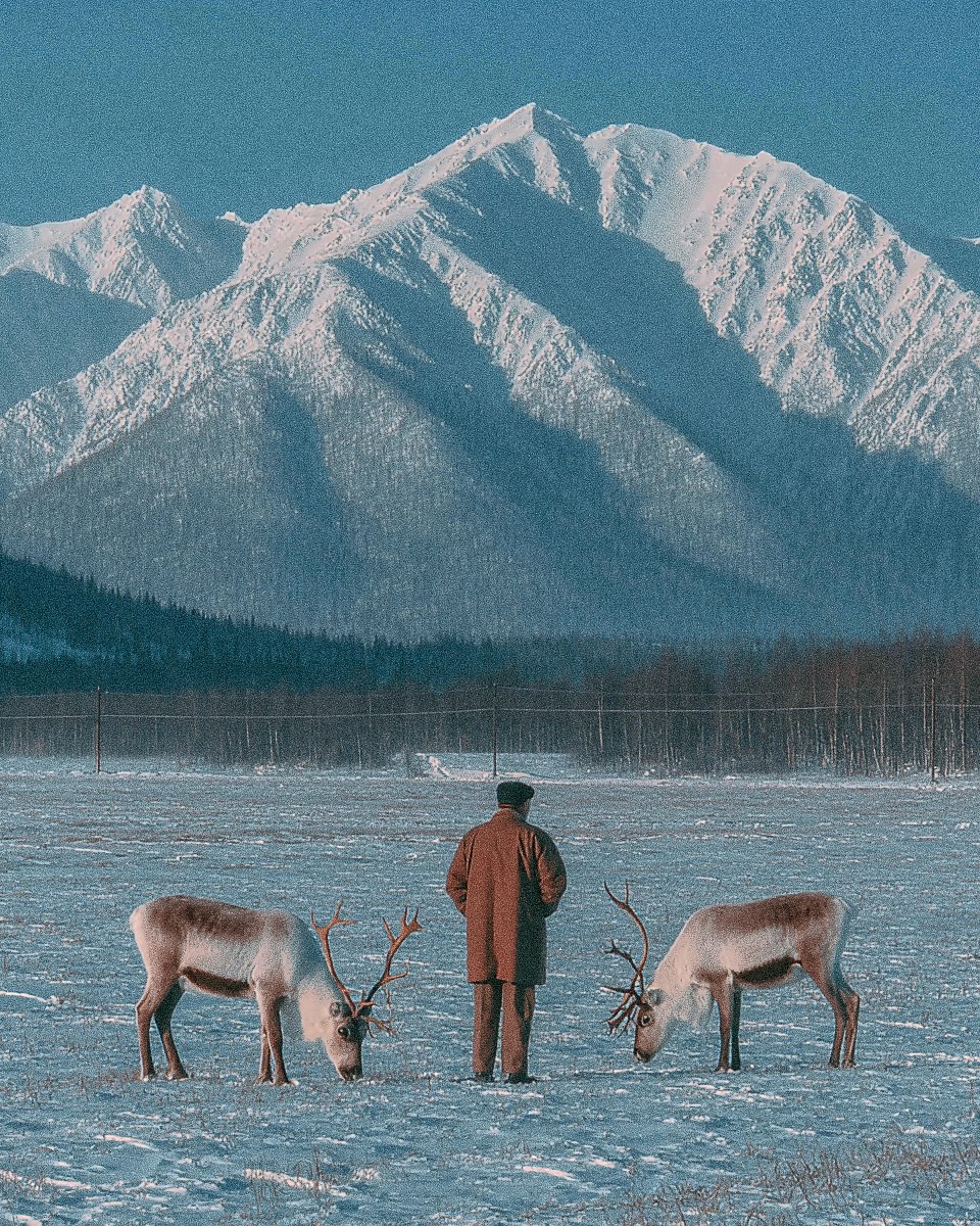 A cinematic shot captures a solitary man in a long, brown coat and cap, standing in a vast, snow-covered field. He is positioned between two large reindeer, their antlers prominently displayed as they graze. The backdrop is dominated by a towering mountain range, blanketed in snow. A muted color palette of blues, whites, and browns creates a serene, wintry atmosphere. The composition is carefully balanced, with the man and animals forming a foreground that leads the eye to the grand mountain scenery. The lighting is soft and diffused, emphasizing the stillness and tranquility of the scene. Add subtle details of frost on the ground and breath visible in the cold air. Shot on 70mm film, grain, photorealistic details.