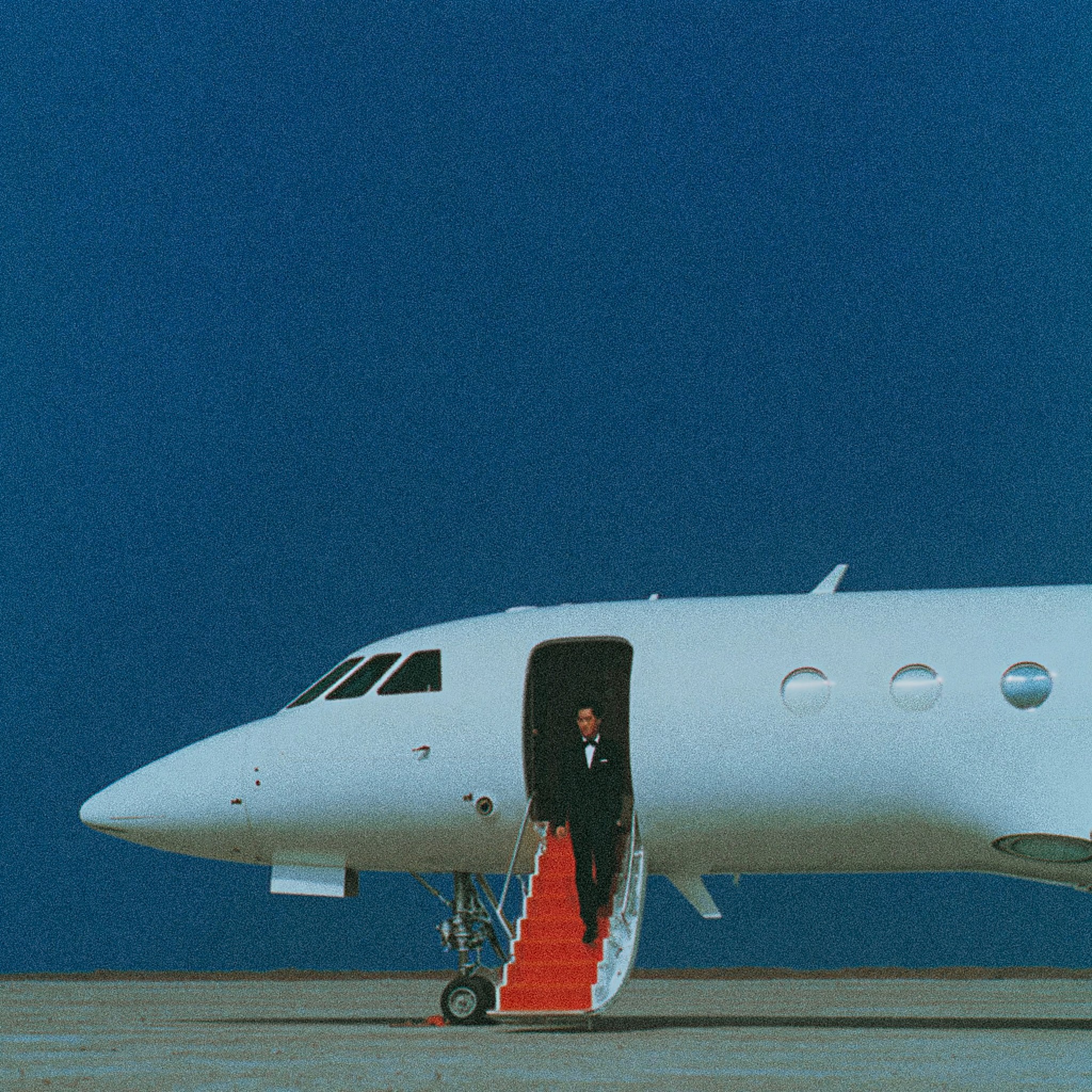 A distinguished man in a classic black tuxedo descends the steps of a private jet onto a vibrant red carpet. The jet, a sleek and modern aircraft, stands against a backdrop of a clear, deep blue sky. The scene is captured in a style reminiscent of a classic film still, with sharp focus and rich colors. Lighting is bright and natural, highlighting the texture of the carpet and the polished surface of the jet. Composition emphasizes the man's confident stride and the grandeur of the aircraft. Add subtle lens flare for cinematic effect. The image evokes themes of success, luxury, and exclusive travel. Render in 8k resolution with meticulous detail, capturing every nuance from the fabric of the suit to the rivets on the plane. Use color grading techniques to enhance the contrast and saturation, creating a visually stunning and memorable image.