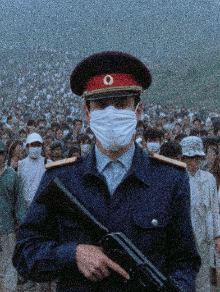 A solemn guard stands vigilant before a vast, masked crowd, his face obscured by a white surgical mask, eyes steely and resolute. He wears a dark blue military uniform adorned with red accents on the hat and shoulders, holding a black rifle firmly in his grip. The masses behind him stretch into the distance, their faces hidden behind identical masks, an ocean of anonymity. The sky is overcast, casting a muted, melancholic light over the scene. The overall atmosphere is tense, hinting at a world gripped by a pandemic or some other crisis, under the watchful eyes of authority. The grainy texture adds a layer of realism, making the image feel like a scene from a dystopian documentary. Capture the palpable tension and uncertainty of this moment in a cinematic still. Inspired by the aesthetics of documentary photography and dystopian film.