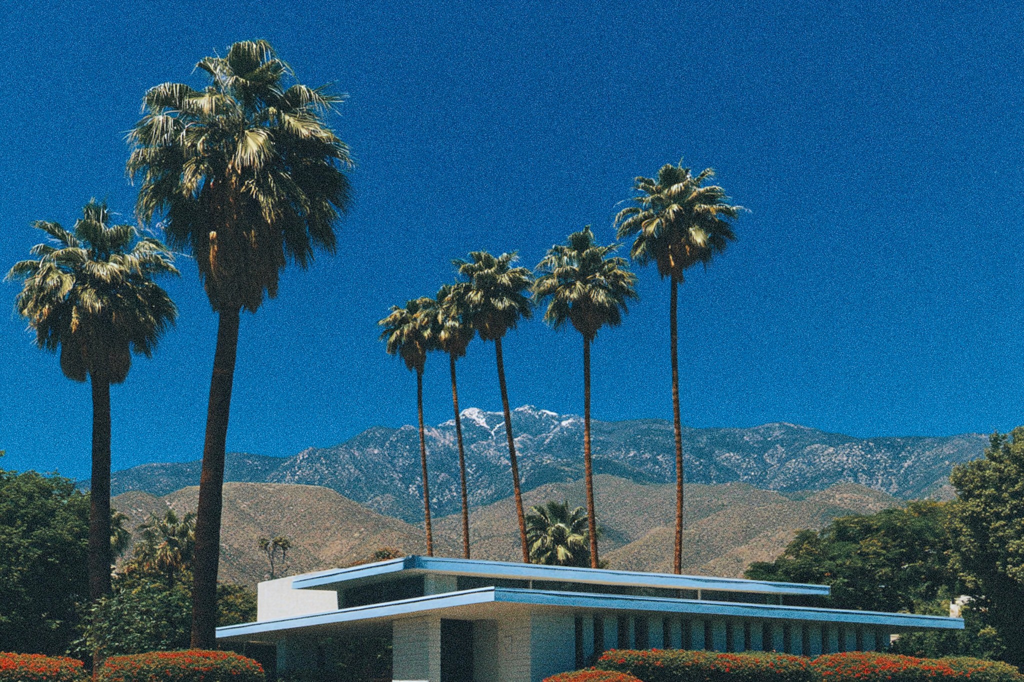 A sun-drenched view of a classic mid-century modern home in Palm Springs, California. Towering palm trees frame the clean lines of the building, casting intricate shadows. The San Jacinto Mountains rise in the background, their peaks dusted with snow. The sky is a vibrant azure, creating a striking contrast with the earthy tones of the desert landscape. Lush bougainvillea bushes add pops of red and pink to the foreground. Capture the essence of desert modernism with meticulous detail, emphasizing the interplay of light and shadow, and the harmony between architecture and nature. Use a Hasselblad camera with a Zeiss lens to capture the sharpness and clarity of the scene. Inspired by the architectural photography of Julius Shulman and the color palettes of David Hockney. Add a subtle grain and vintage color grading.