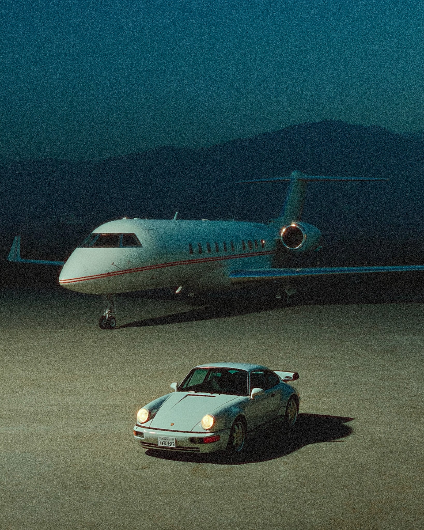 Create a dramatic scene at dusk featuring a white Porsche 911 parked prominently in the foreground, with a private jet situated directly behind it. The composition should emphasize the luxury and exclusivity of both vehicles. The Porsche should have its headlights on, casting a soft glow on the ground, while the private jet's windows should be subtly illuminated. In the background, depict a silhouette of distant mountains against a dark, textured sky, invoking a sense of adventure and freedom. The overall mood should be cinematic, with a cool color palette and subtle film grain to enhance the atmosphere. Use detailed textures and lighting to showcase the elegance and design of both the car and the jet, capturing the essence of high-end travel and automotive excellence. Pay close attention to the interplay of light and shadow, emphasizing the contours and curves of the vehicles, adding depth and dimensionality to the scene. Consider adding a slight vignette to draw the viewer's eye towards the center of the composition.