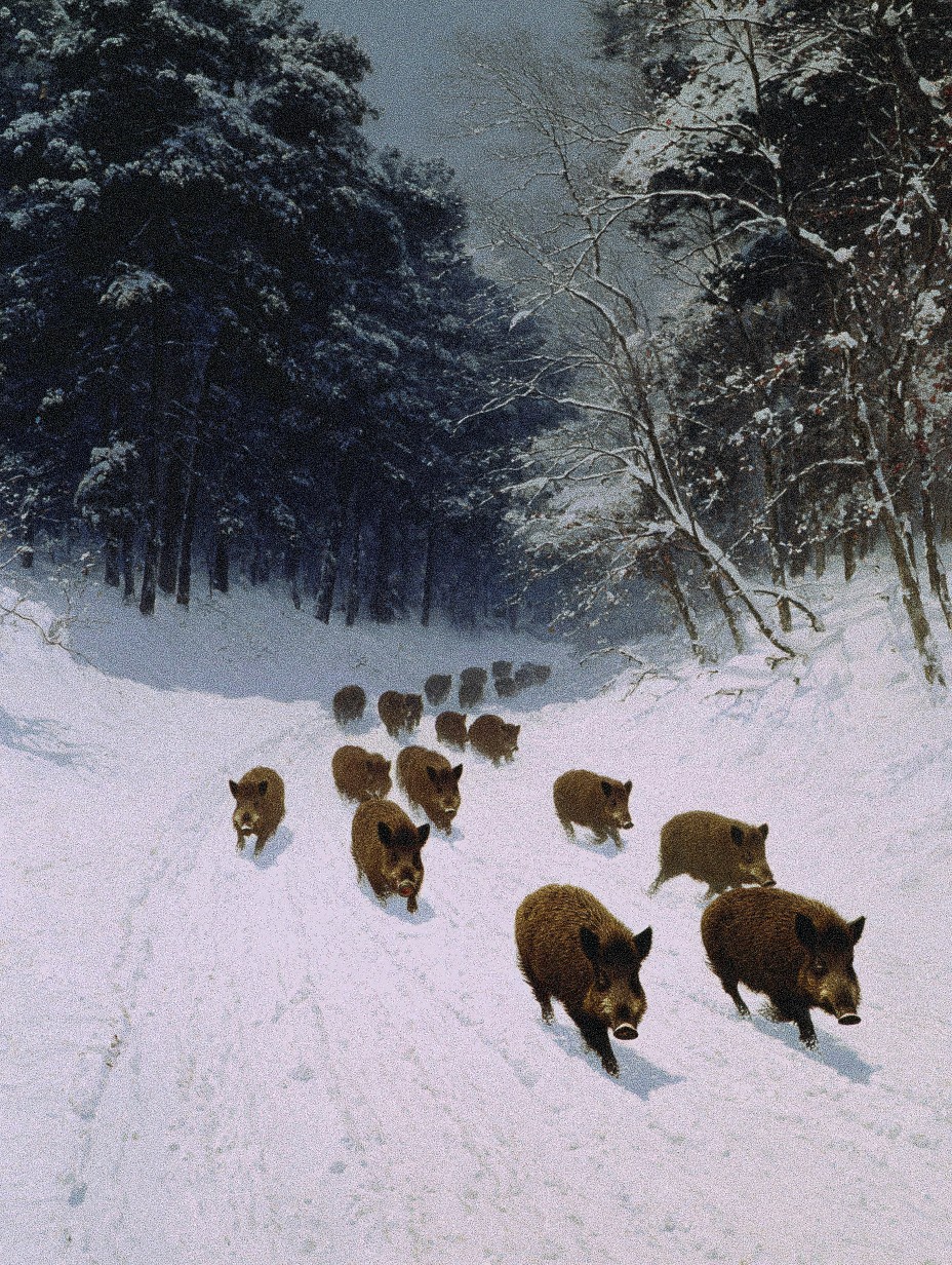 Create a painting in the style of 19th-century realism featuring a herd of wild boars making their way through a snow-covered forest. The composition should highlight the contrast between the dark, textured fur of the boars and the bright, untouched snow. The forest should consist of tall, bare trees with a hint of snow clinging to their branches. Capture the muted, cold tones of winter with subtle variations in the whites and grays of the snow and the browns and blacks of the trees and boars. Focus on creating a sense of depth and movement within the scene, with the boars positioned at varying distances from the viewer. The overall mood should be one of stark beauty and the resilience of nature in winter.