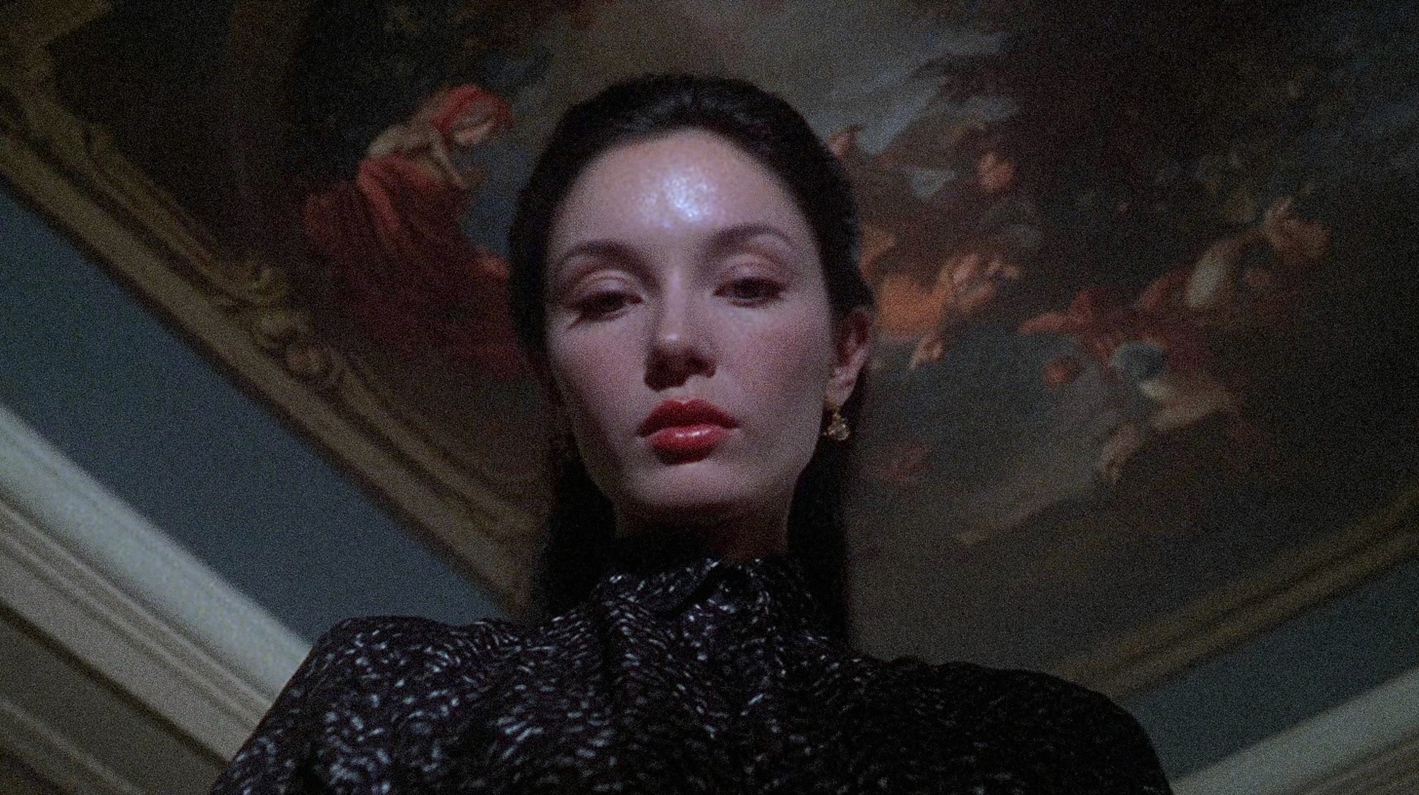 A striking low-angle portrait of a beautiful woman with dark hair and pale skin, reminiscent of classic Hollywood glamour. Her expression is enigmatic, with a hint of sadness in her eyes. She wears a dress with intricate details and subtle shimmer. The background features a painted ceiling in a classical style, with angels and figures in dynamic poses, rendered in rich reds, blues, and gold. The lighting is moody and dramatic, with deep shadows and soft highlights accentuating her features and the textures of her clothing and the background. The overall effect is one of timeless beauty, mystery, and restrained emotion, reminiscent of a vintage film still. Use a shallow depth of field to blur the background slightly, drawing focus to the woman's face. Add a subtle film grain effect to enhance the vintage feel. The composition should emphasize the woman's upward gaze, inviting the viewer to connect with her inner world. --ar 3:2 --style expressive