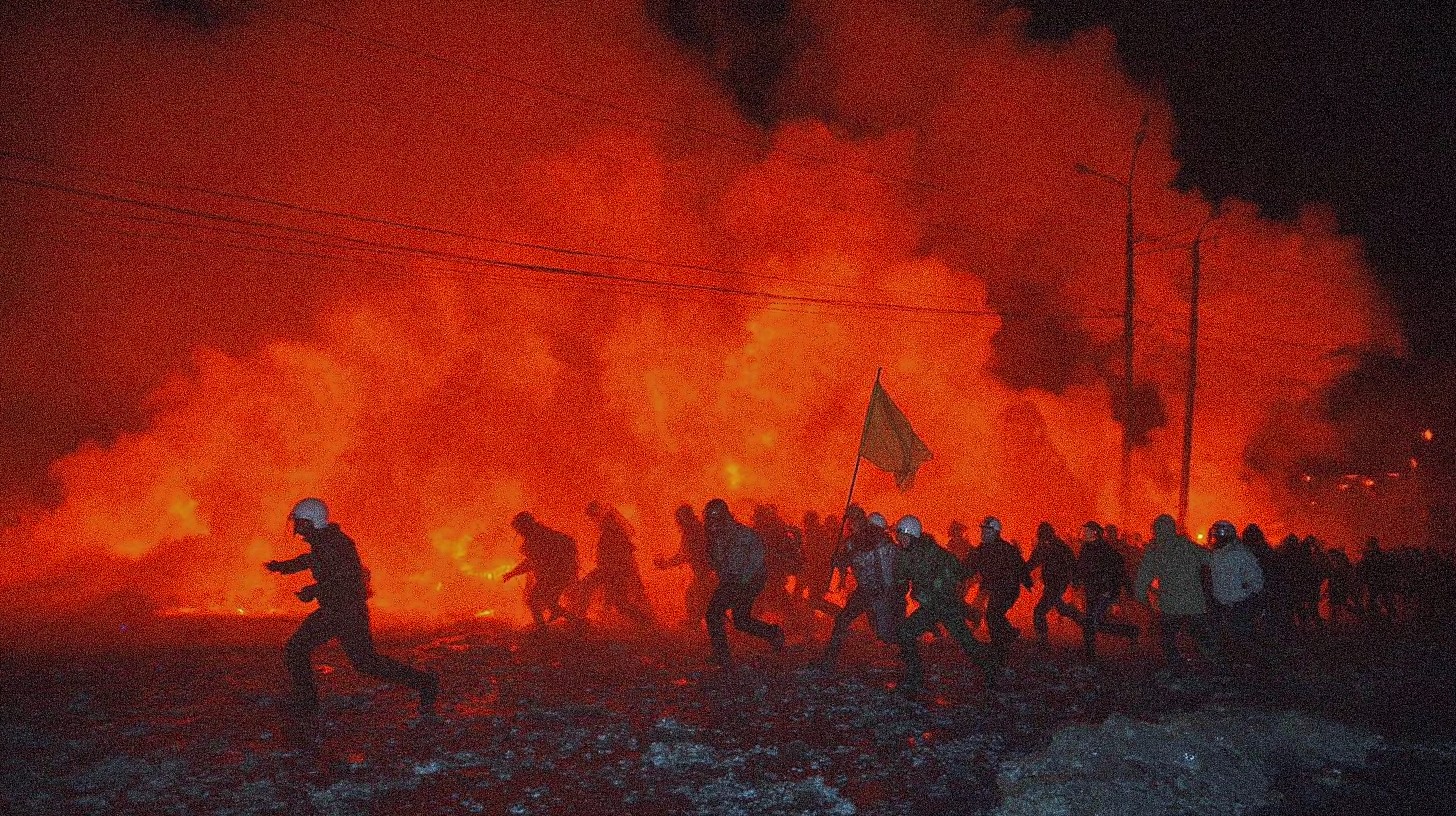 A dramatic and intense photograph capturing a chaotic scene of people running through a field engulfed in orange flames and thick smoke. The figures are silhouetted against the fiery backdrop, their forms conveying a sense of urgency and fear. The air is thick with smoke and the scene is lit only by the flickering flames, creating a hellish atmosphere. Include details of demonstrators or protesters amidst the chaos, and a yellow flag. Capture the intensity of the moment. Use a high-resolution, wide-angle lens to emphasize the scale of the event. Style: Documentary photography, gritty and raw, with a sense of realism and immediacy. Medium: Color photograph, enhanced contrast. Lighting: Dramatic lighting from the fire, casting long shadows. Composition: Balanced composition with a strong focal point on the figures running, emphasizing motion and chaos.