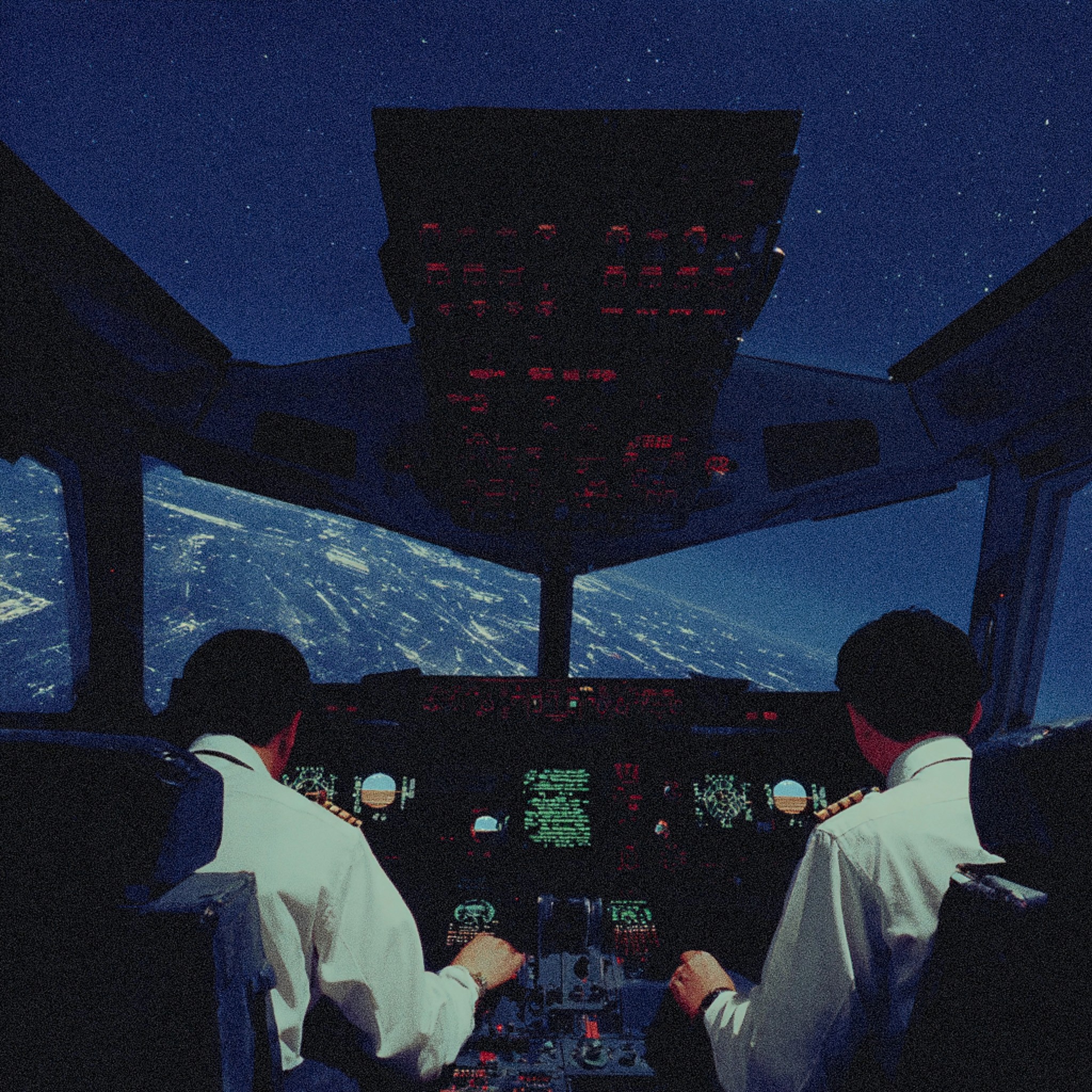 A photograph from inside a plane cockpit at night. Two pilots in white shirts are seen from behind, their hands on the controls. The dashboard is lit up with numerous lights and displays, creating a sense of complexity. Outside the windshield, a sprawling city is visible, its lights creating an intricate network across the landscape. Above, the night sky is filled with stars, adding to the sense of wonder and awe. The image should capture the beauty of flight and the dedication of the pilots, ultra quality, 8k, realistic, cinematic lighting.