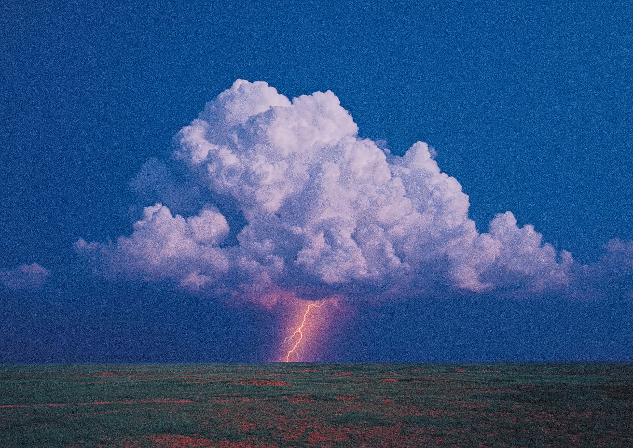 A breathtaking photograph captures a solitary, large cumulus cloud formation dominating the dark blue sky above a flat, endless prairie. A brilliant bolt of lightning descends from the cloud, illuminating the landscape below. The sky transitions from deep blue to a lighter hue near the horizon, emphasizing the vastness of the scene. The prairie is a mix of green and brown grasses, creating a textured foreground. The overall composition conveys a sense of drama, power, and the sheer scale of nature's forces. Capture the sharp details of the lightning bolt and the soft textures of the cloud. Cinematic lighting, hyperrealistic detail, 8k resolution, shot on a Canon EOS R5 with a 24-70mm lens, f/2.8, ISO 100, emphasizing the contrast between light and shadow.