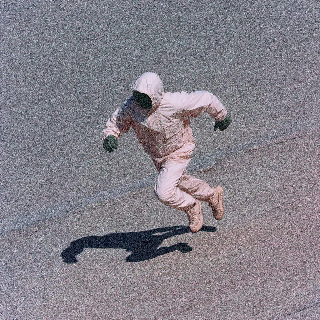 A solitary figure, shrouded in a pale pink, hooded jumpsuit, is captured in motion, running with a sense of urgency or escape down a vast, undulating slope. The fabric of the jumpsuit appears to be a soft, slightly textured material, catching the light in subtle ways to reveal the form beneath. Their face is obscured, adding to the air of mystery. The ground beneath their feet is a pale, sandy color, with a grainy texture that suggests a desert landscape or a man-made structure of similar material. The light source is bright and direct, casting a sharp, elongated shadow that stretches out behind the figure, emphasizing their isolation. The overall mood is one of tension and determination. Render the scene with a focus on texture and shadow, using a color palette dominated by pale pinks, beiges, and subtle grays, adding depth and dimension. The photograph aesthetic, 35mm film grain, photorealistic detail.