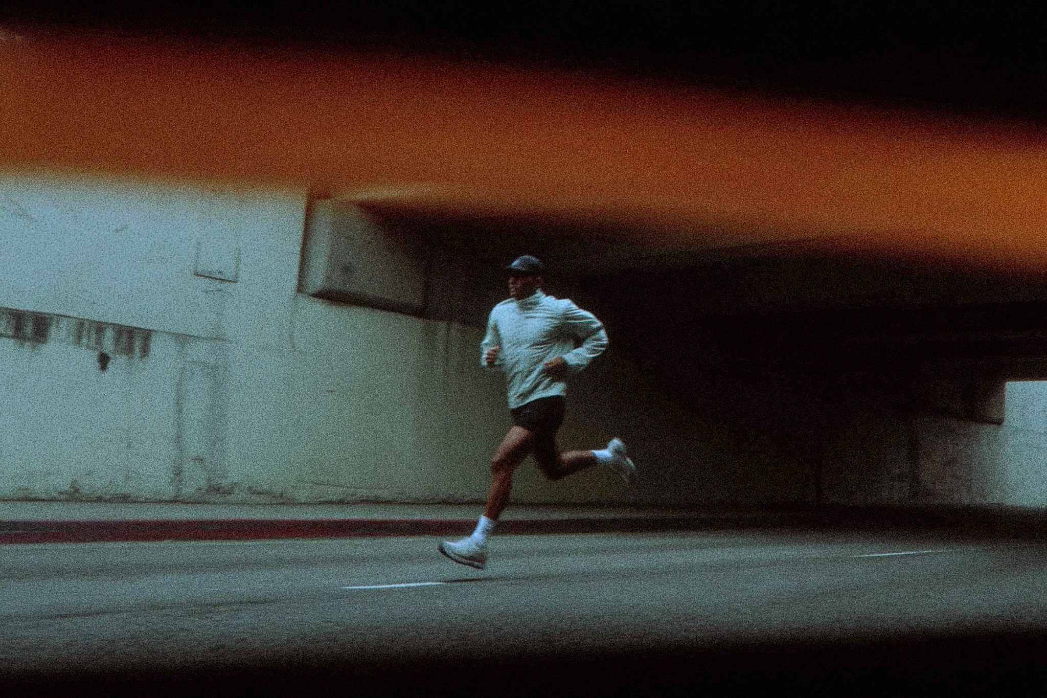 A full shot captures a man running with determined expression under an overpass, focused action shot, urban background with concrete structures, gritty street aesthetic, cinematic lighting with a focus on shadows and highlights, muted color palette of grays and greens with a touch of orange from the sky, film grain, dynamic motion blur, emphasis on muscular physique, detailed sportswear textures (running shorts, long sleeve shirt, athletic shoes), dramatic angle, high-resolution photography, 8k, realistic portrayal, style of film photography from the 1970s, vintage color grade, dark mood, high detail, bokeh.