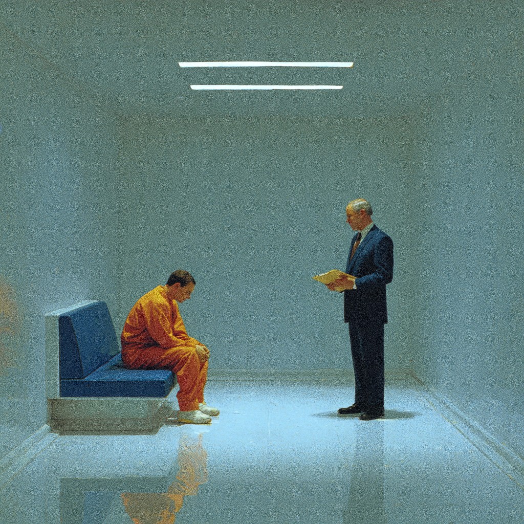 A photograph capturing a tense, somber meeting between an inmate and his lawyer in a minimalist setting. The inmate, clad in an orange jumpsuit, is seated on a blue bench, head bowed, conveying dejection and anxiety. The lawyer, dressed in a dark suit, stands facing him, holding documents that seem to hold the inmate's fate. The room is characterized by stark, white walls and cold, sterile lighting, enhancing the atmosphere of confinement and despair. The composition should be simple yet powerful, focusing on the body language and facial expressions of the two figures to convey the emotional weight of the situation. Incorporate elements of film noir to heighten the drama, with shadows and contrast playing a key role in emphasizing the tension. Cinematic lighting, detailed textures, high resolution, 8k. Art by Gregory Crewdson.