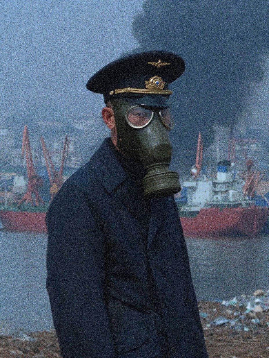 A photograph of a lone figure standing on a polluted beach, wearing a dark military cap and a vintage gas mask, grim industrial harbor in the distant background, featuring cargo ships and smokestacks billowing black smoke, the scene is desaturated, gritty, and cinematic, creating a haunting atmosphere, a color palette of muted blues, grays, and rust tones enhance the bleakness, the photograph is captured with a medium format camera using a 50mm lens, focusing on the figure's masked face, use heavy grain to add to the realism, reminiscent of documentary photography from a dystopian future, shot on Kodak Portra 400 film, f/2.8 aperture, ISO 400, 1/125 shutter speed, ambient light with slight underexposure, post-processing includes subtle dodging and burning to emphasize the stark contrast, shot in a style similar to Gregory Crewdson but with a more raw and unfiltered feel