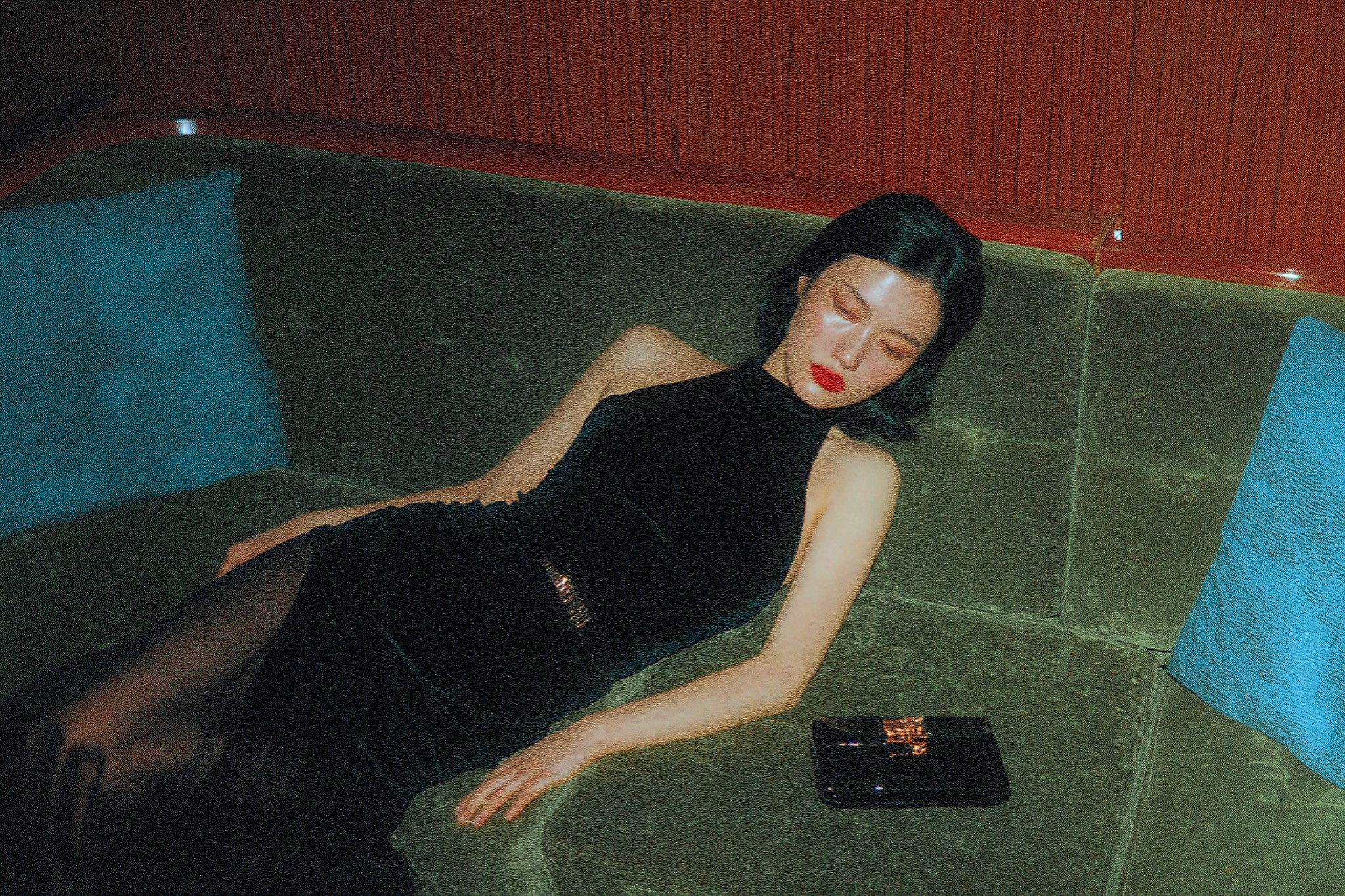 A dimly lit interior, casting soft shadows across a vintage-style green velvet couch. A slender woman, dressed in a sleek black halter-neck dress with a subtle slit, reclines gracefully on the couch, eyes gently closed. Her dark hair is styled in soft waves, accentuating her radiant, porcelain skin and striking red lipstick. A small, elegant black clutch sits beside her. The backdrop features rich red curtains, creating a sense of warmth and intimacy. The overall ambiance is one of quiet luxury, reminiscent of a high-fashion editorial. The style should evoke the mood of a late-night jazz club, subtle grain, film photography, 85mm lens, f1.8 aperture.
