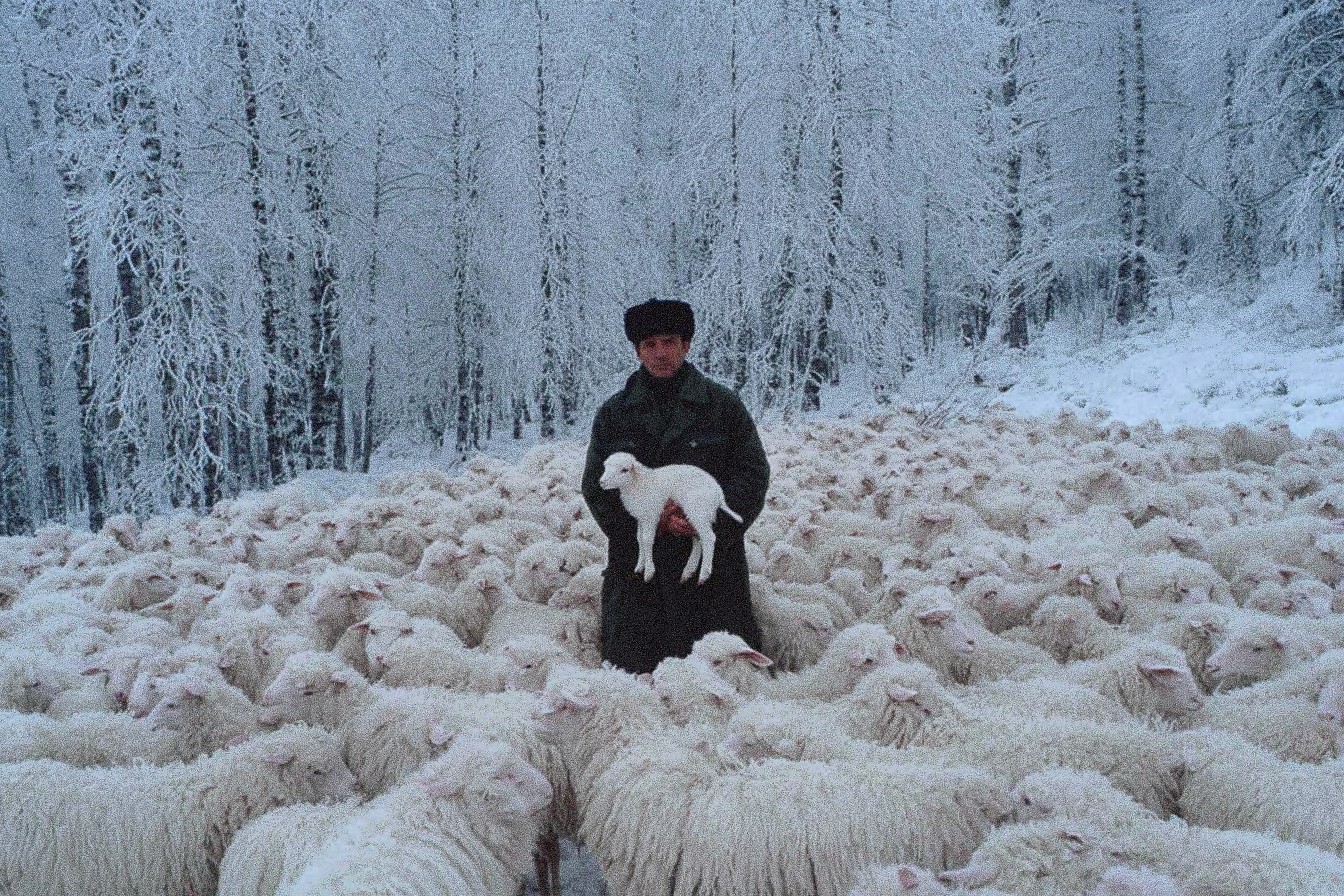 A cinematic shot of a shepherd standing amidst a vast flock of sheep in a serene winter landscape. The ground is covered in soft, pristine snow, and the trees in the background are frosted with ice. The shepherd, dressed in a dark green coat and fur hat, is holding a lamb in his arms. The lamb is white and fluffy, and its eyes are closed. The sheep are huddled together, their woolly coats providing warmth against the cold. The lighting is soft and diffused, creating a sense of peace and tranquility. The camera angle is slightly low, emphasizing the scale of the scene and the smallness of the shepherd in comparison to the flock and the landscape. The color palette is muted, with shades of white, gray, and green dominating the scene. The overall effect is one of quiet beauty and pastoral serenity. Photorealistic, 8k, detailed.