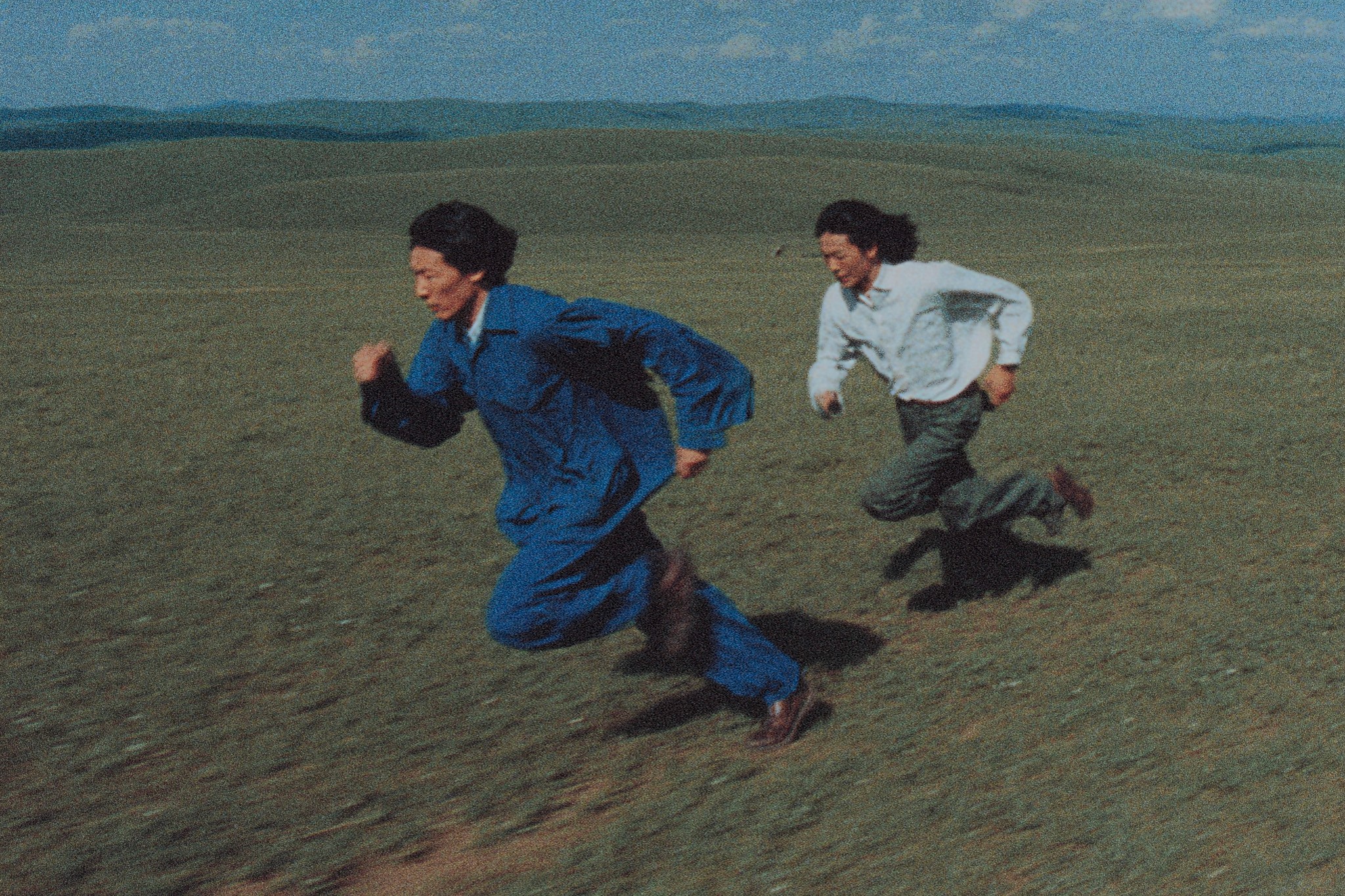 A cinematic shot of two figures running across a vast, open landscape, bathed in the soft light of a late afternoon. The primary figure, dressed in a striking blue jumpsuit, leads the charge, determination etched on their face. The second figure, in a contrasting white shirt and muted trousers, follows closely behind, their expression mirroring the leader's resolve. The landscape itself is a character, a seemingly endless grassy plain that stretches to the horizon, where rolling hills meet a clear blue sky dotted with wisps of clouds. The wind whips through the grass, creating a sense of movement and urgency. The image should capture the essence of freedom, the thrill of the chase, and the beauty of the natural world. Use a color palette inspired by vintage film photography, with a slight grain and muted tones. Emphasize the contrast between the figures' clothing and the landscape, creating a visually striking composition. The style should be realistic yet evocative, capturing the emotional intensity of the scene.