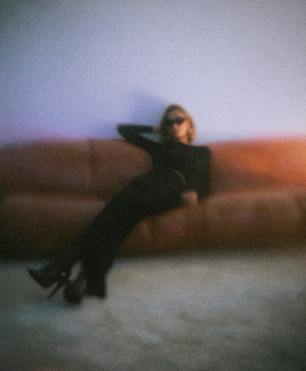 A cinematic portrait of a stylish woman, wearing dark, elegant clothing and oversized sunglasses, casually reclining on a vintage orange couch. The setting is a minimalist room with soft, diffused lighting casting subtle shadows on the pale wall. The composition should emphasize the woman's relaxed pose and confident demeanor. Capture the subtle details of her attire and the texture of the couch, while maintaining a slightly grainy aesthetic reminiscent of film photography. The lighting should be warm and inviting, creating a sense of intimacy and allure. Consider adding subtle visual effects to enhance the cinematic feel. Photorealistic, high resolution, detailed textures, soft focus, shallow depth of field, film grain, cinematic lighting, stylish fashion, confident pose, vintage furniture.