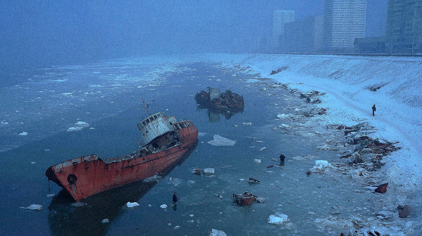 A wide, cold, and misty cityscape featuring several partially submerged shipwrecks in the foreground; the water is filled with ice floes, and the wrecks are rusty and deteriorating, suggesting a long period of abandonment; in the background, a snow-covered embankment stretches along the water's edge, with a lone figure standing at the edge; beyond the embankment, tall, imposing city buildings loom through the mist, their shapes blurred by the heavy atmosphere; the overall mood is bleak and desolate, with a limited color palette dominated by shades of blue, gray, and white, accentuating the scene's coldness and decay; shot with a medium format camera, capturing high detail and clarity in the foreground elements, while the background fades into a soft, misty blur, adding depth and atmosphere to the composition; cinematic lighting, emphasizing the texture of the ice and the rust on the ships, creates a dramatic and visually striking image.